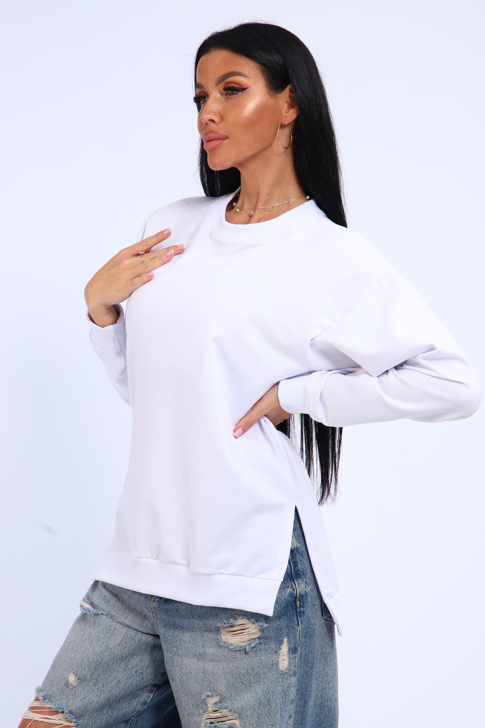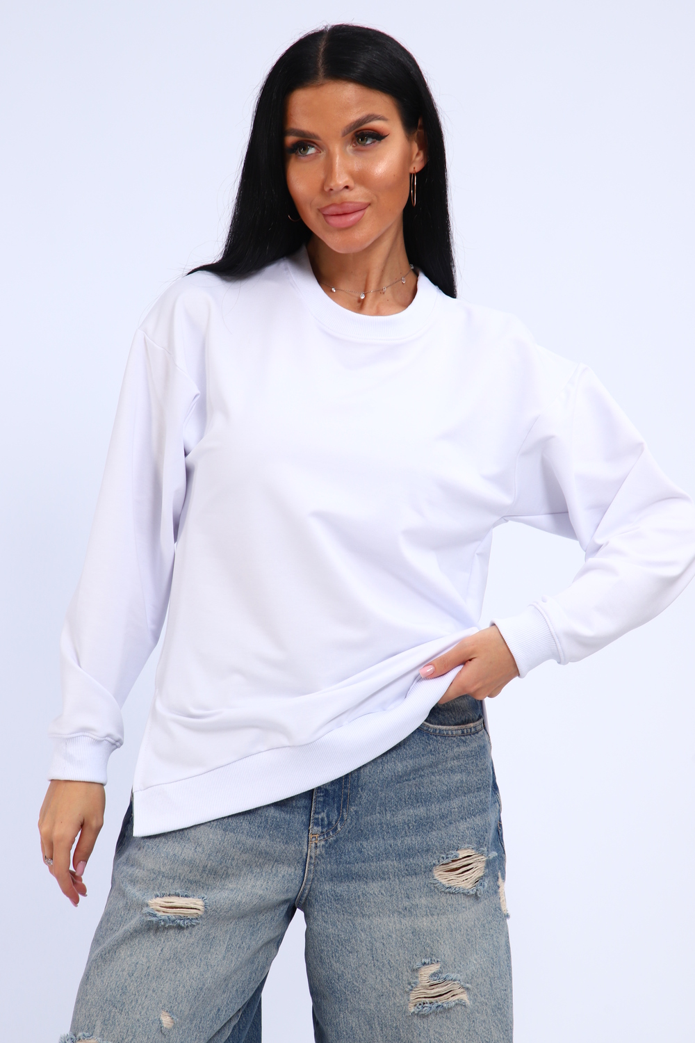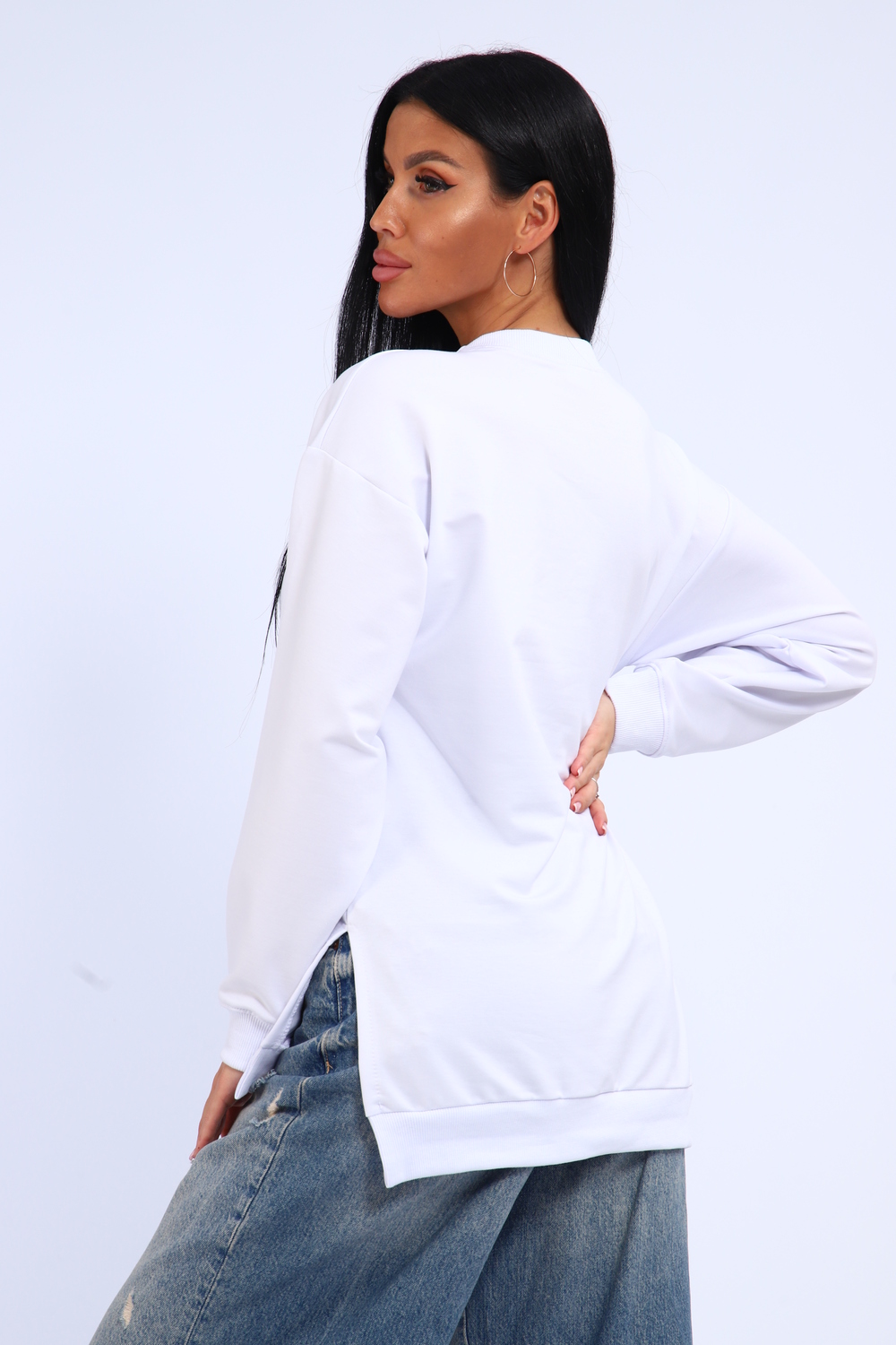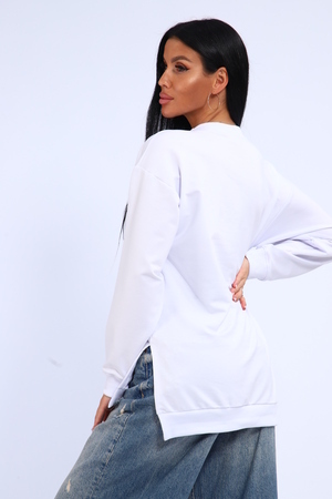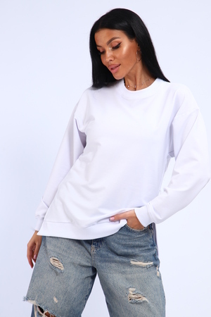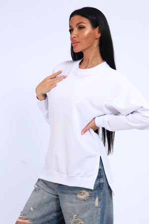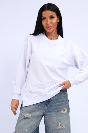 Свитшот женский свободного кроя, в боковых швах разрезы. Спинка удлиненная.