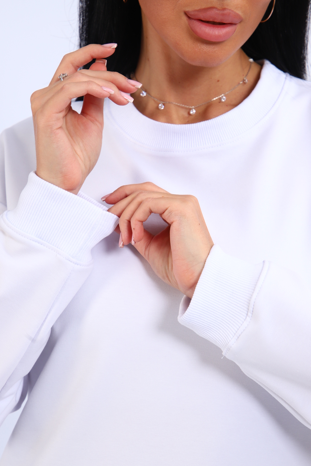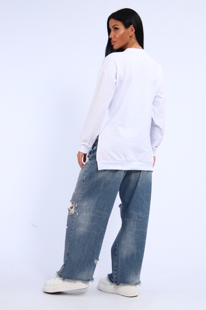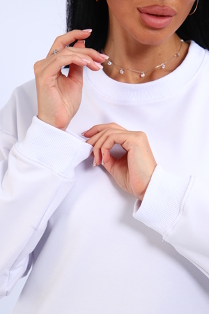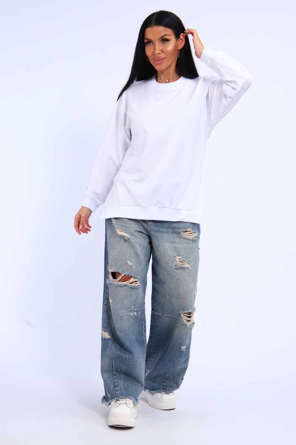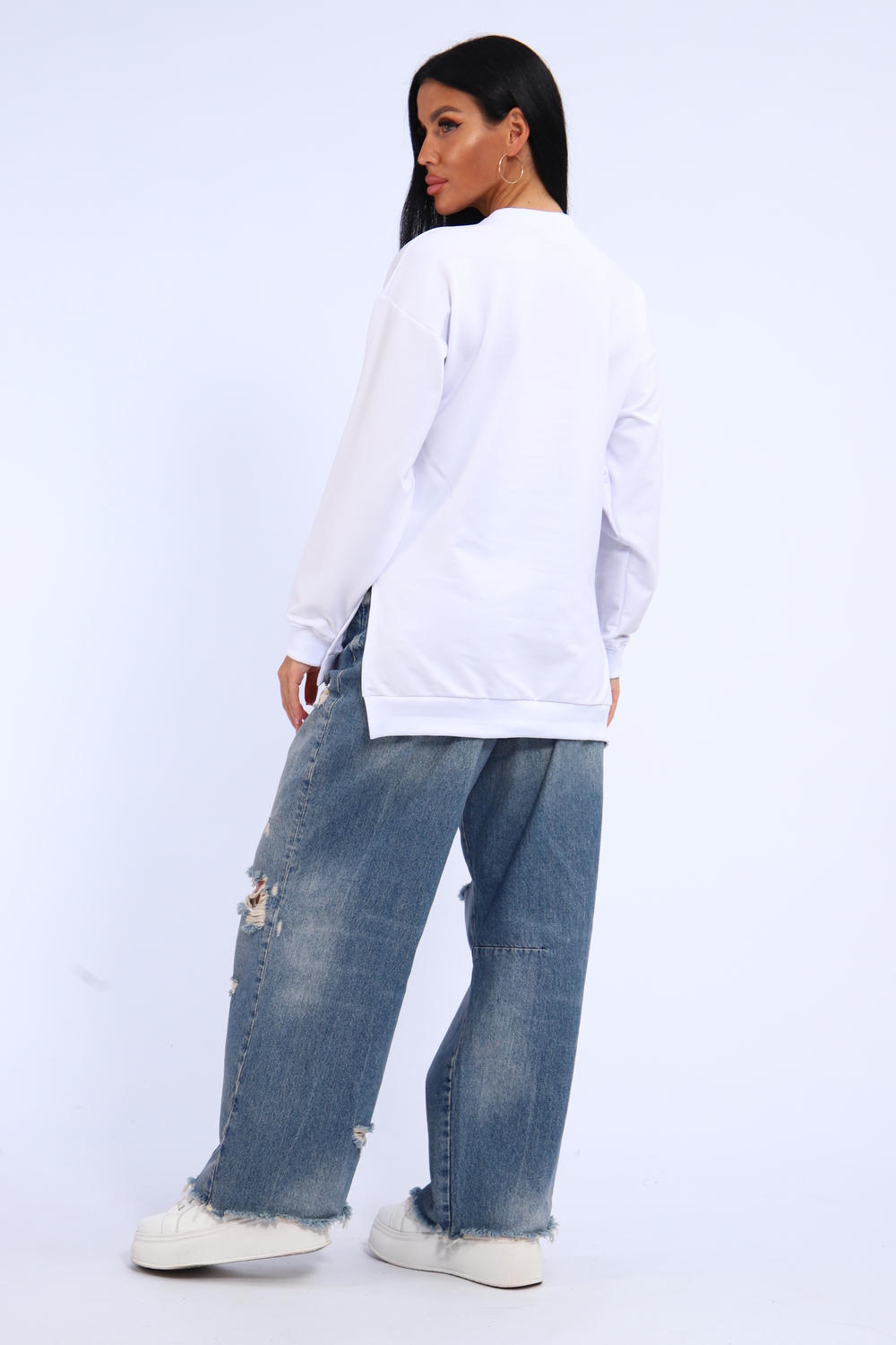 Свитшот женский свободного кроя, в боковых швах разрезы. Спинка удлиненная.