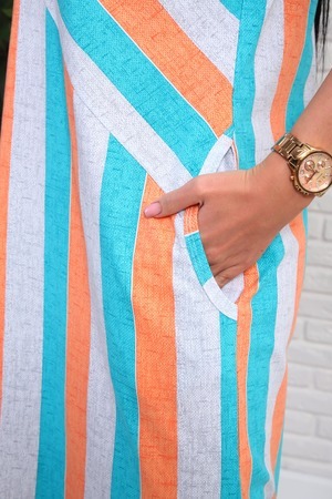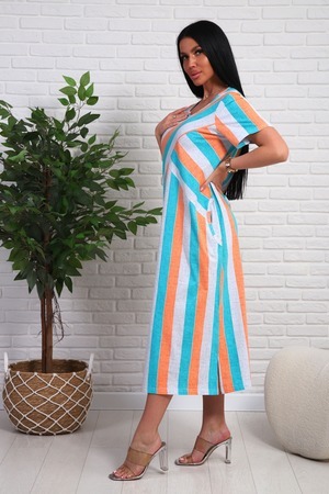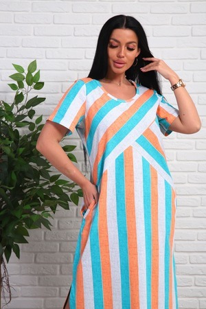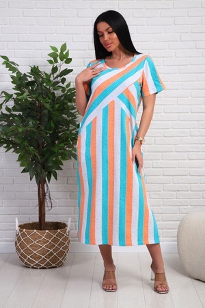 Платье из натурального набивного трикотажа. Силуэт прямой. Длина миди. Рукав короткий. Горловина круглая. На полочке фигурные подрезы. Карманы и разрезы в боковых швах.