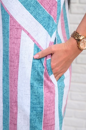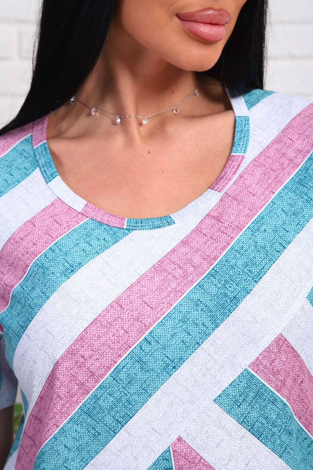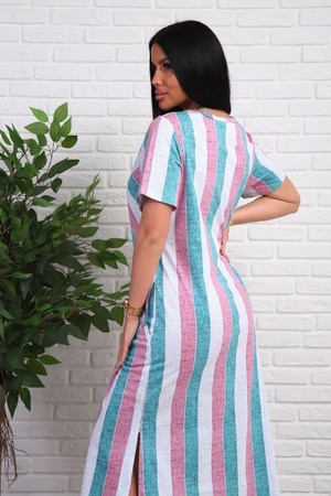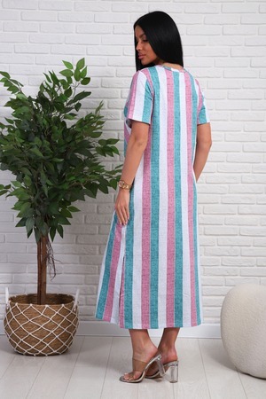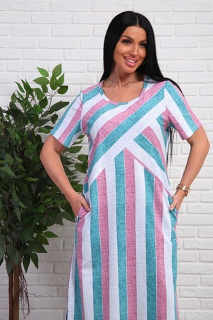 Платье из натурального набивного трикотажа. Силуэт прямой. Длина миди. Рукав короткий. Горловина круглая. На полочке фигурные подрезы. Карманы и разрезы в боковых швах.