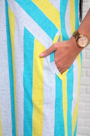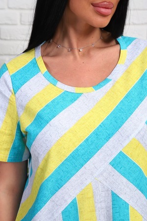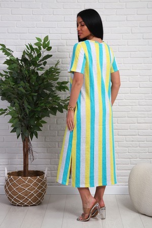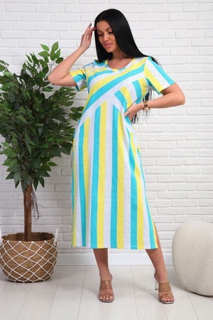 Платье из натурального набивного трикотажа. Силуэт прямой. Длина миди. Рукав короткий. Горловина круглая. На полочке фигурные подрезы. Карманы и разрезы в боковых швах.