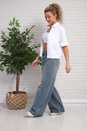 Бомбер-рубашка из премиального сатина, универсальный белый цвет. Короткий рукав (на одном из рукавов нашивка), пояс на резинке.
