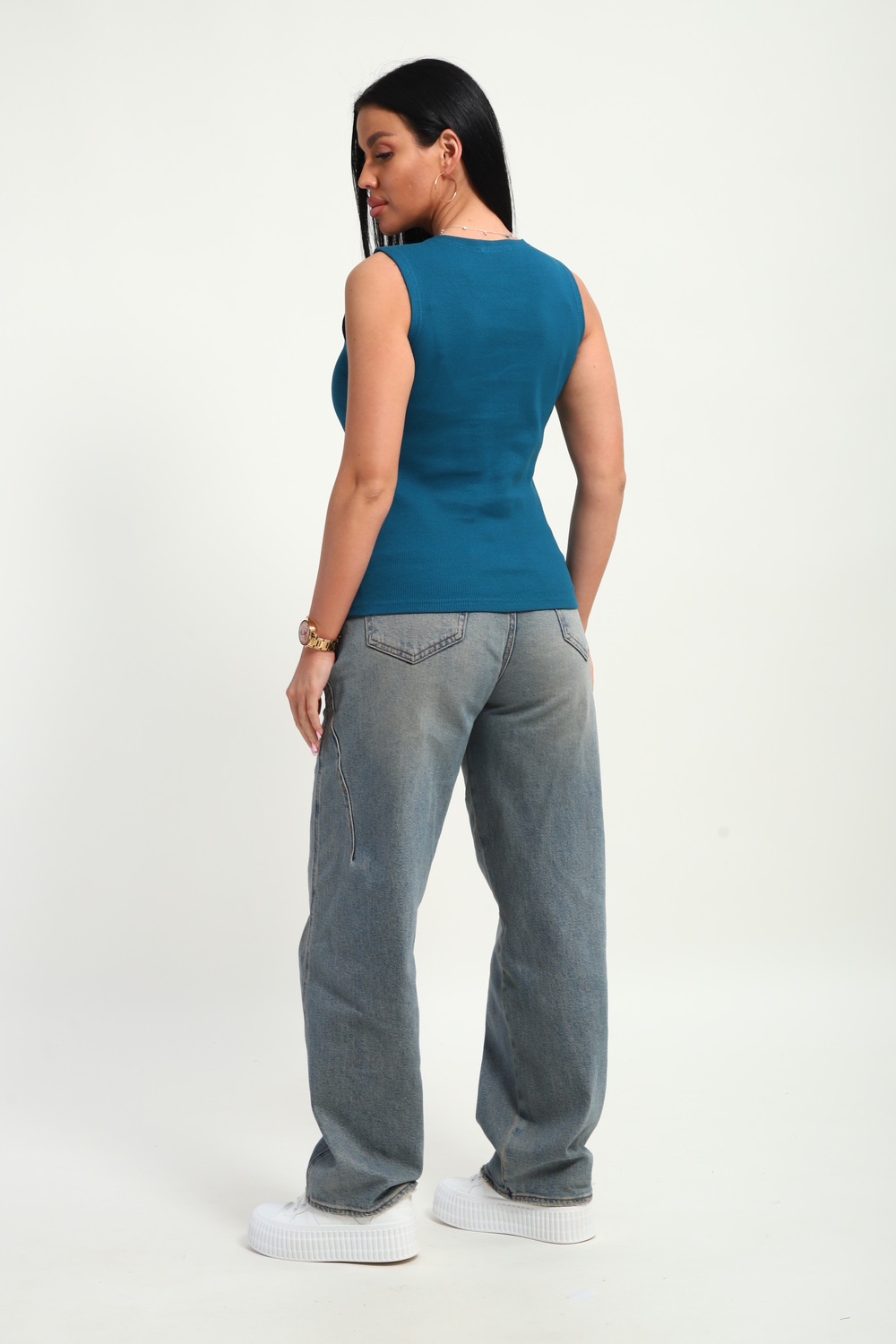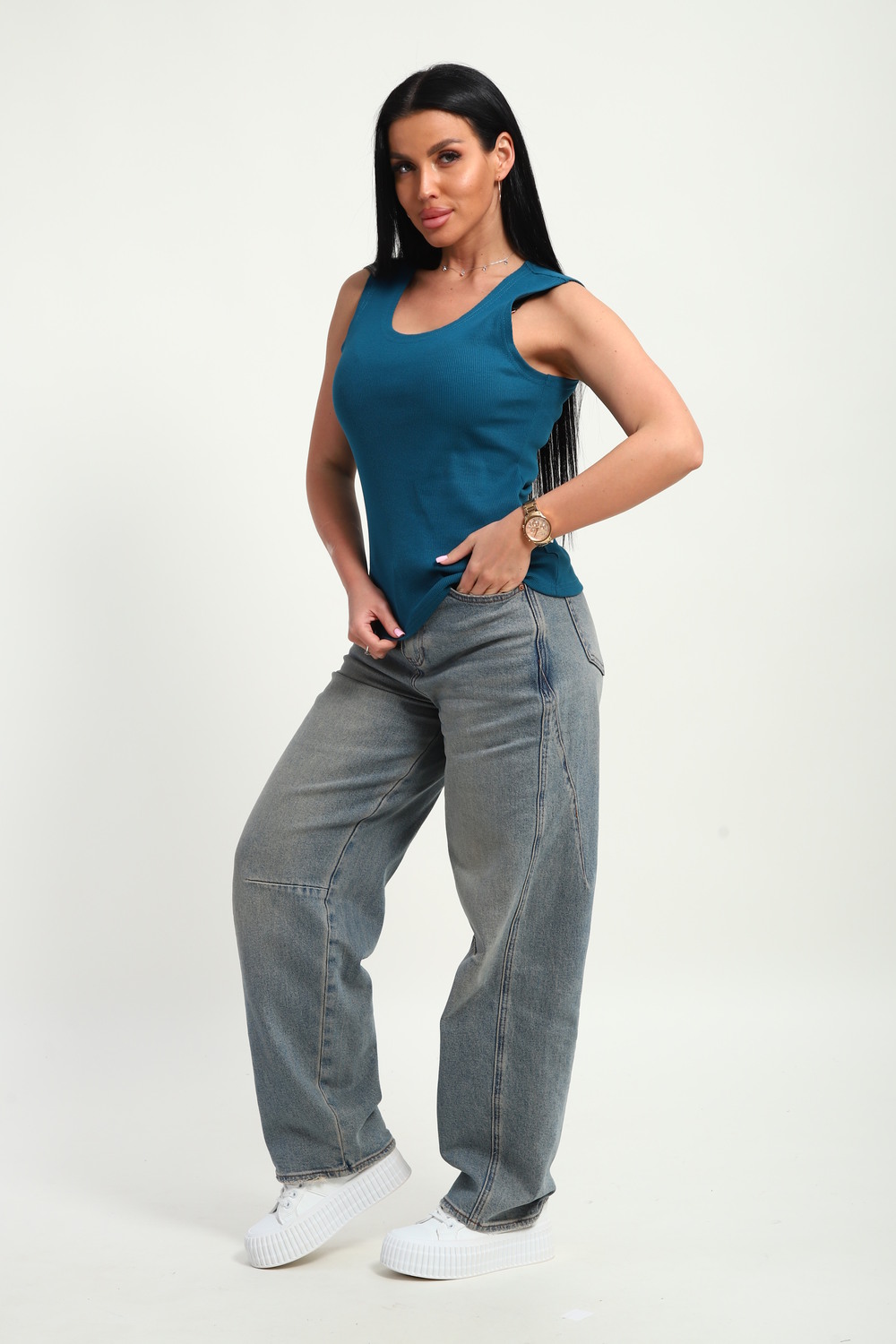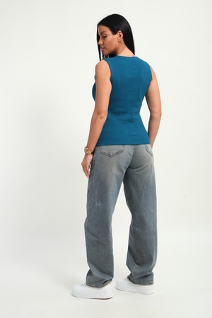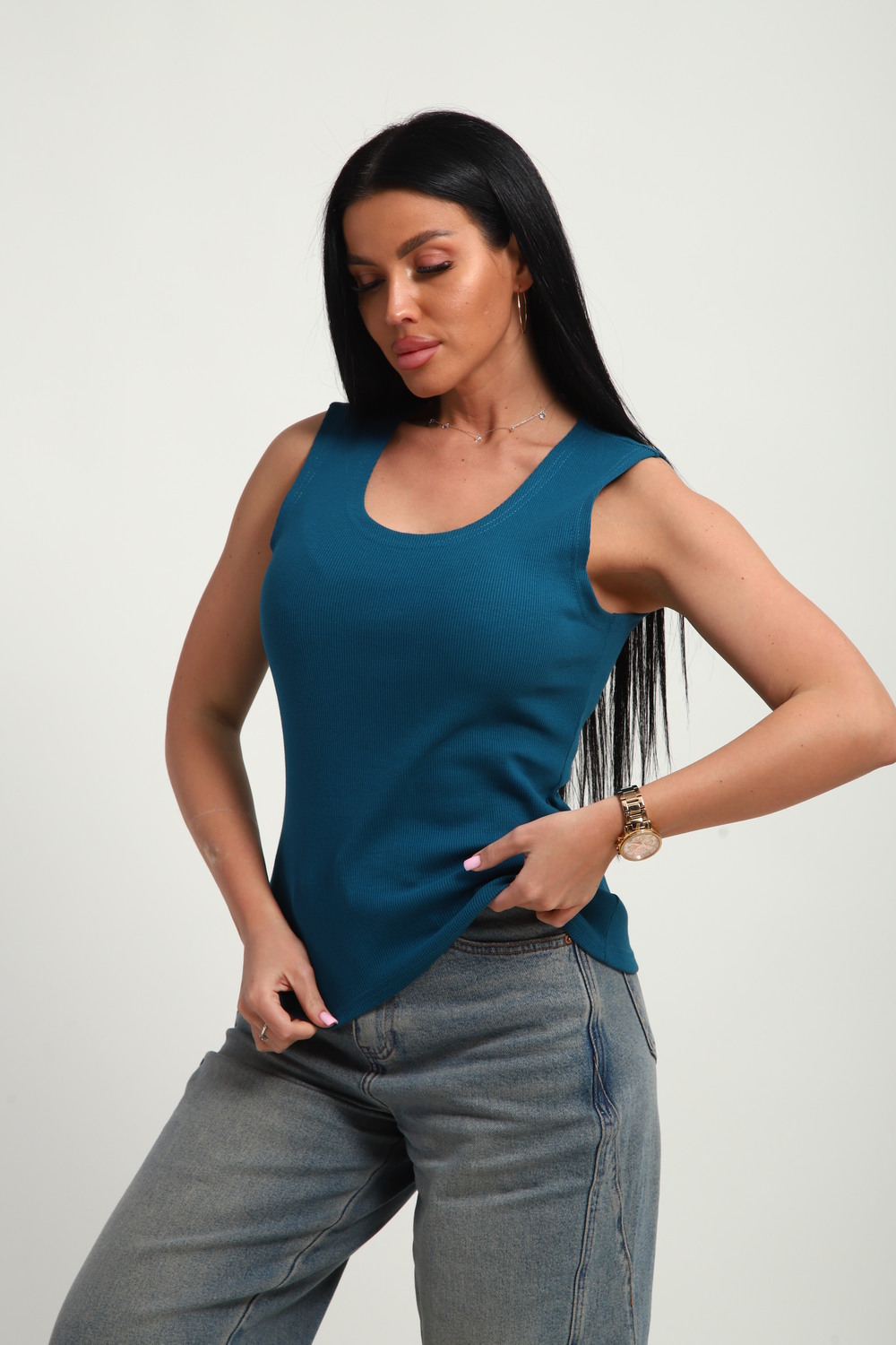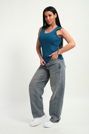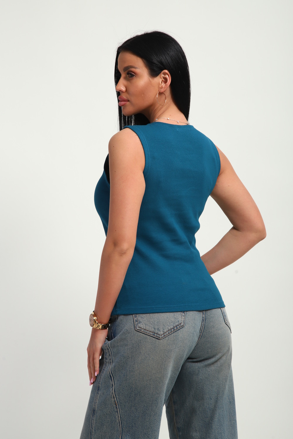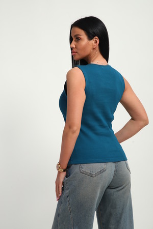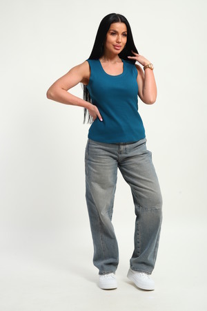 Трендовый топ, сшит из приятной к телу ткани. Материал кашкорсе с фактурой в рубчик, хорошо тянется и очень комфортна в носке. Эстетичная модель с круглым вырезом имеет качественный пошив и отлично держит форму.