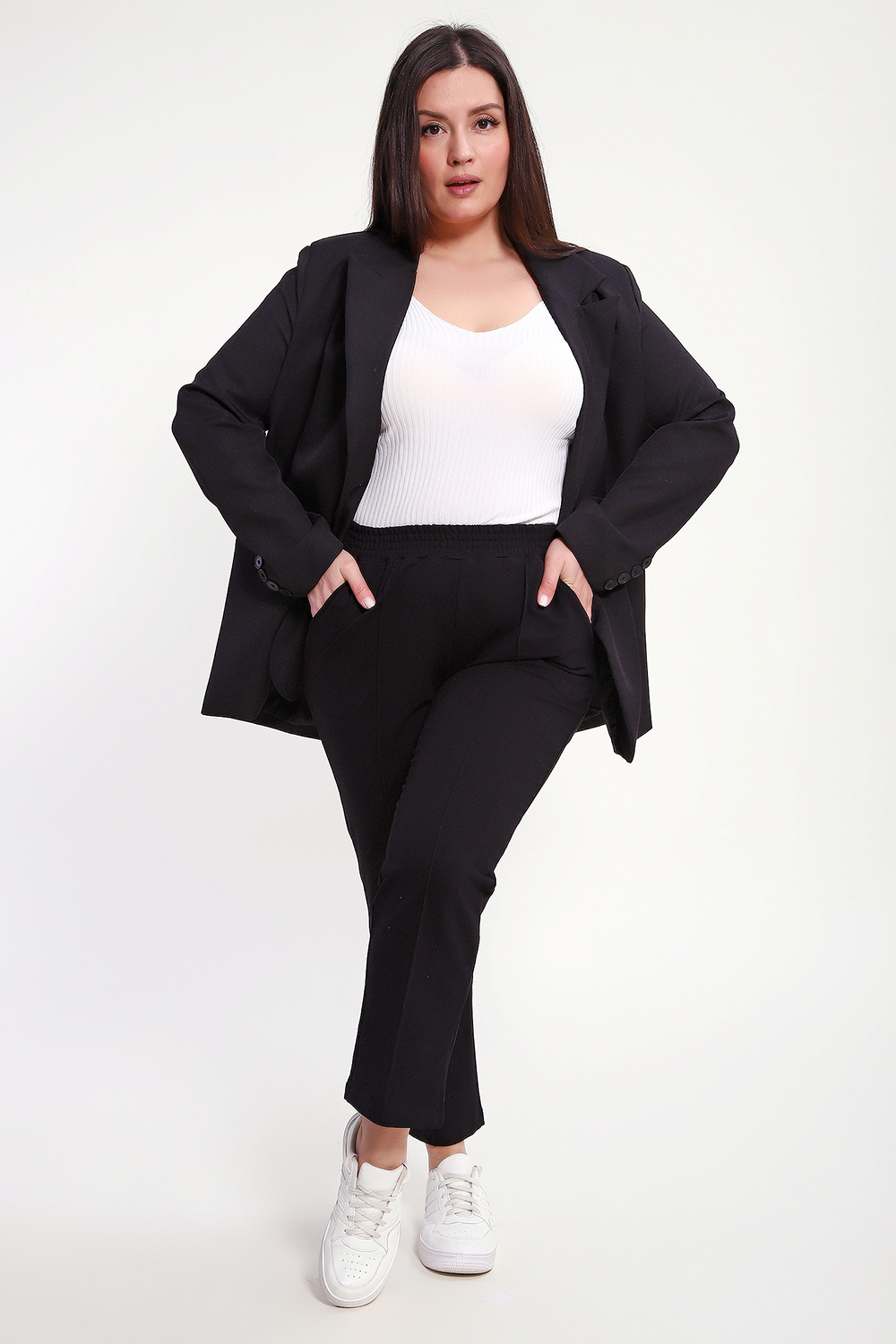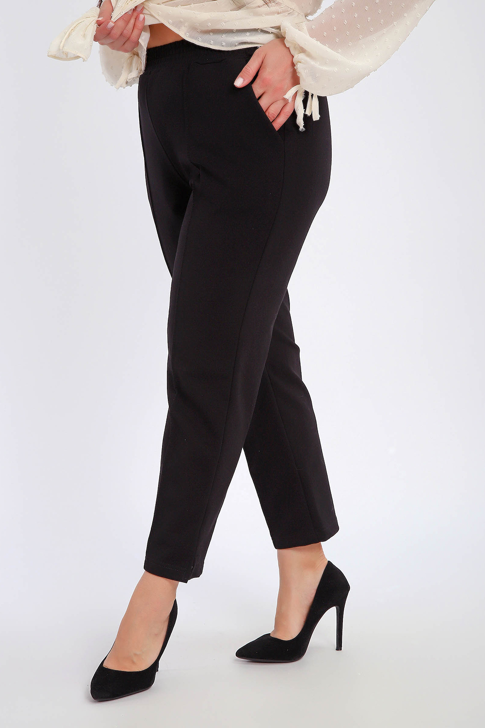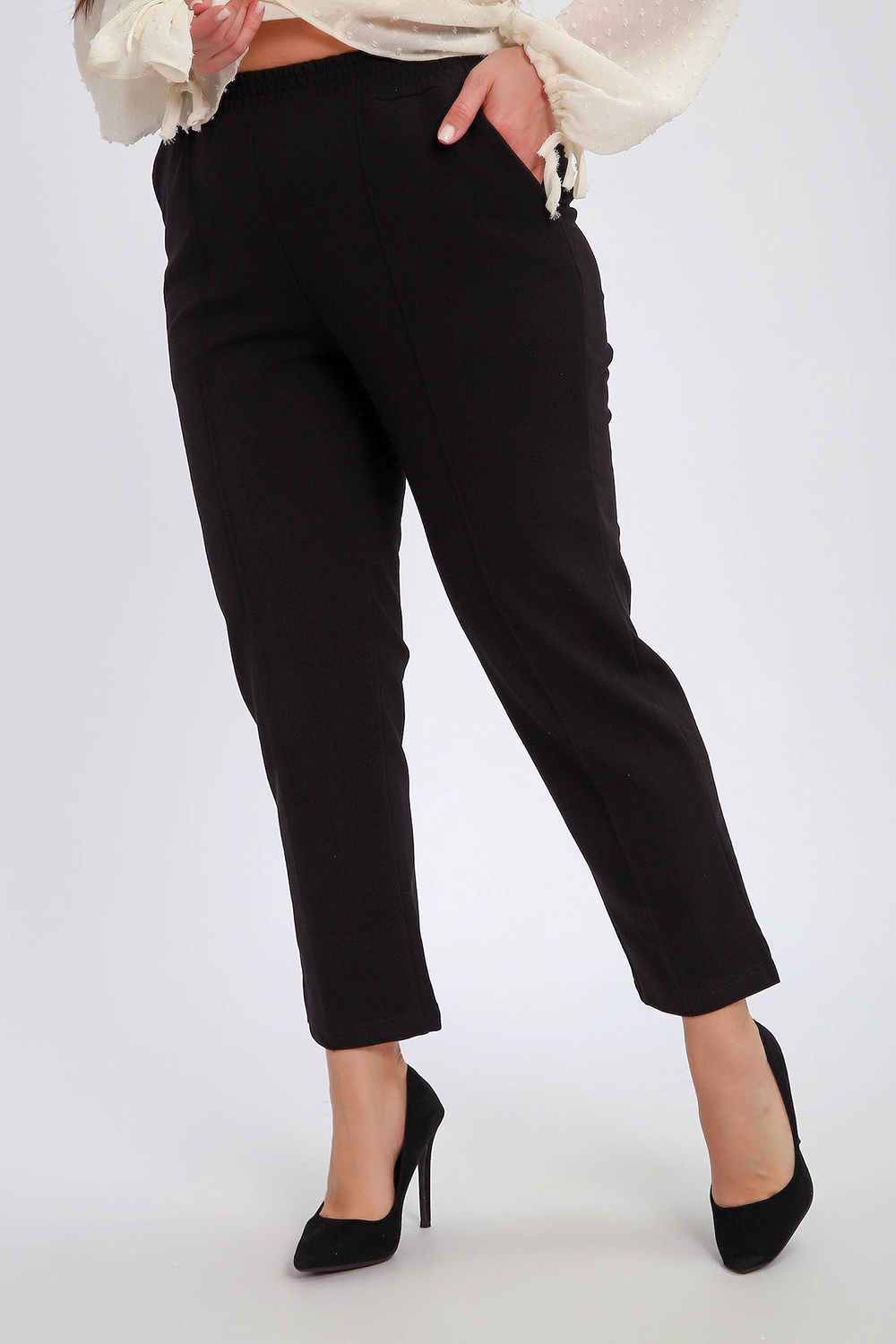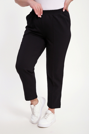 Брюки женские укороченные со стрелками и с карманами. Модель брюк 7/8, внизу по боковому шву маленький разрез, что делает брюки более элегантнее. Пояс брюк обработан на поясной машине, что делает брюки удобными и практичными при носке. Благодаря зауженному к низу крою брюки визуально стройнят фигуру. Прошитые спереди стрелки визуально удлиняют ноги. Брюки выполнены из лёгкого трикотажа на основе хлопка с добавлением эластичных волокон. Мягкая ткань приятна к телу, не сковывает движения и отлично сохраняет форму. Универсальные, классические брюки позволяют создавать множество образов: от повседневного стиля до продуманного офисного.