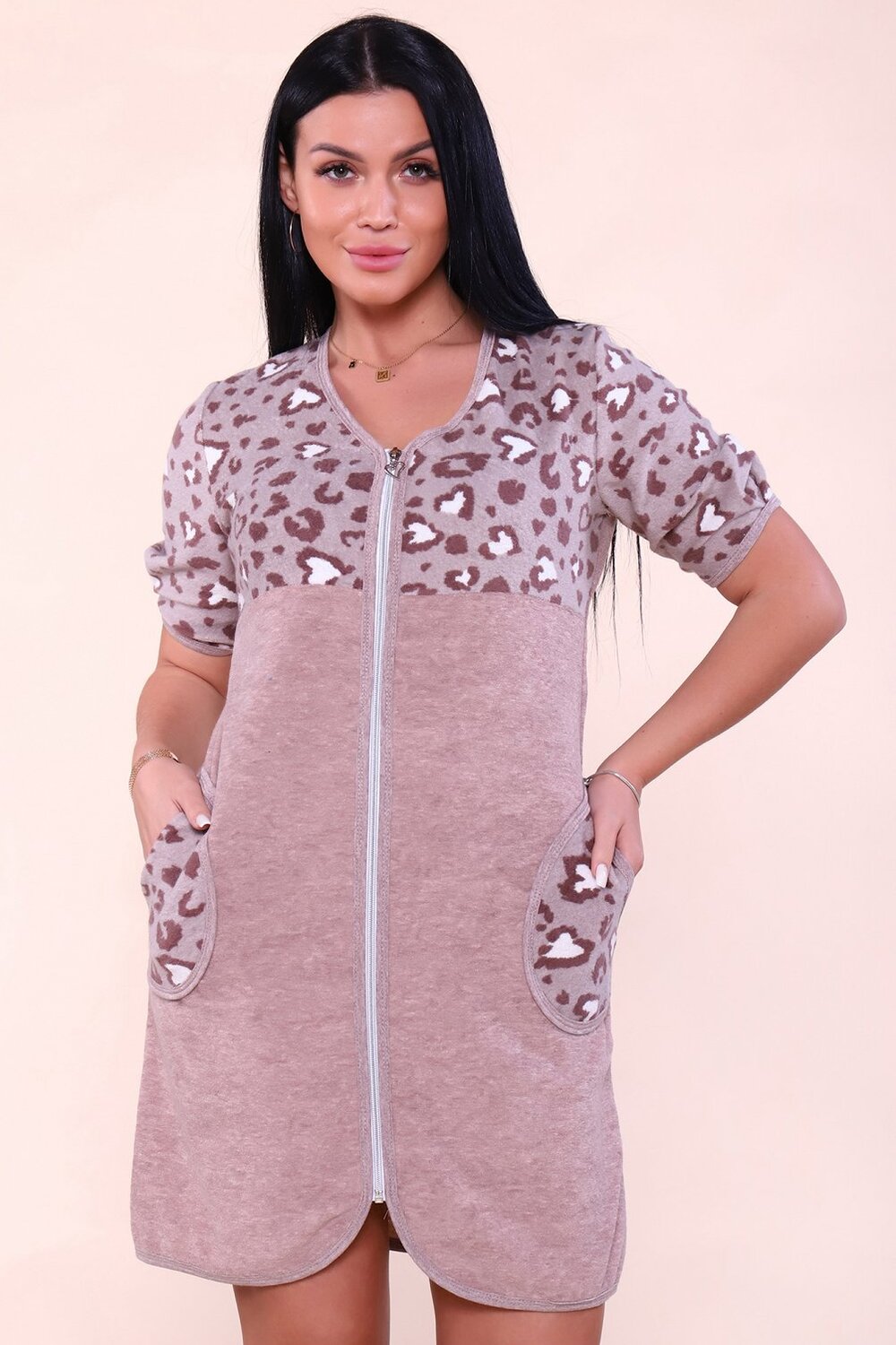 Дизайн: Эффектная комбинация материалов. Верхняя часть с карманами украшена набивным леопардовым принтом, а основная выполнена из однотонной махры, что создает гармоничный и свежий образ.