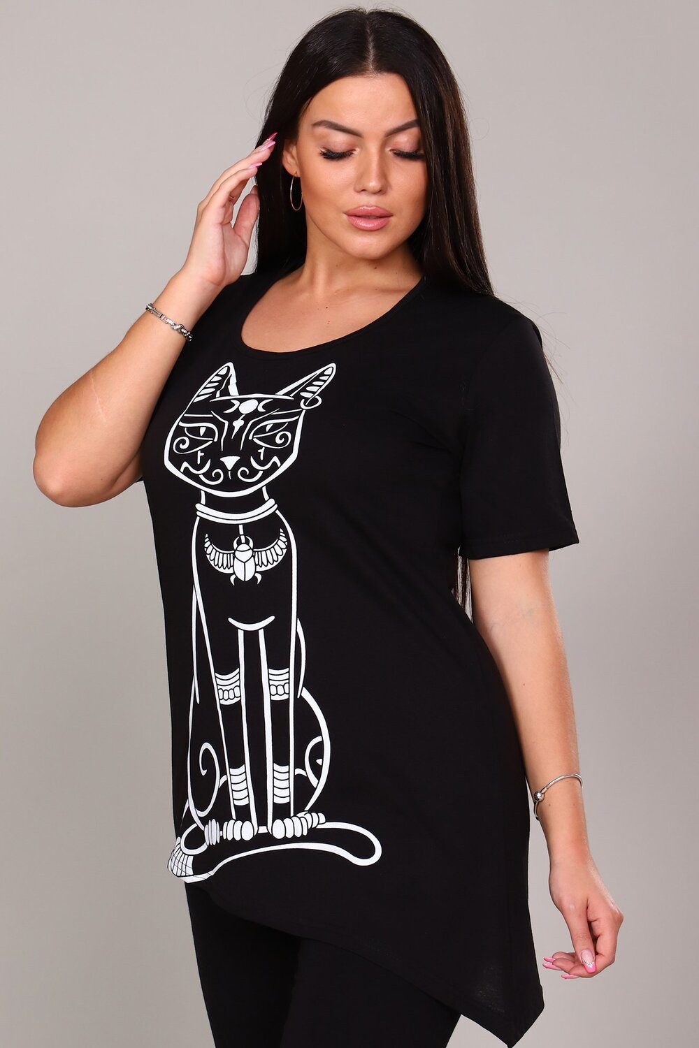 Принт «Египетская кошка»: Центральный элемент дизайна — стилизованный принт с изображением священной египетской кошки (Бастет). Это изображение придает изделию особый шарм, нотку мистики и восточной экзотики.
