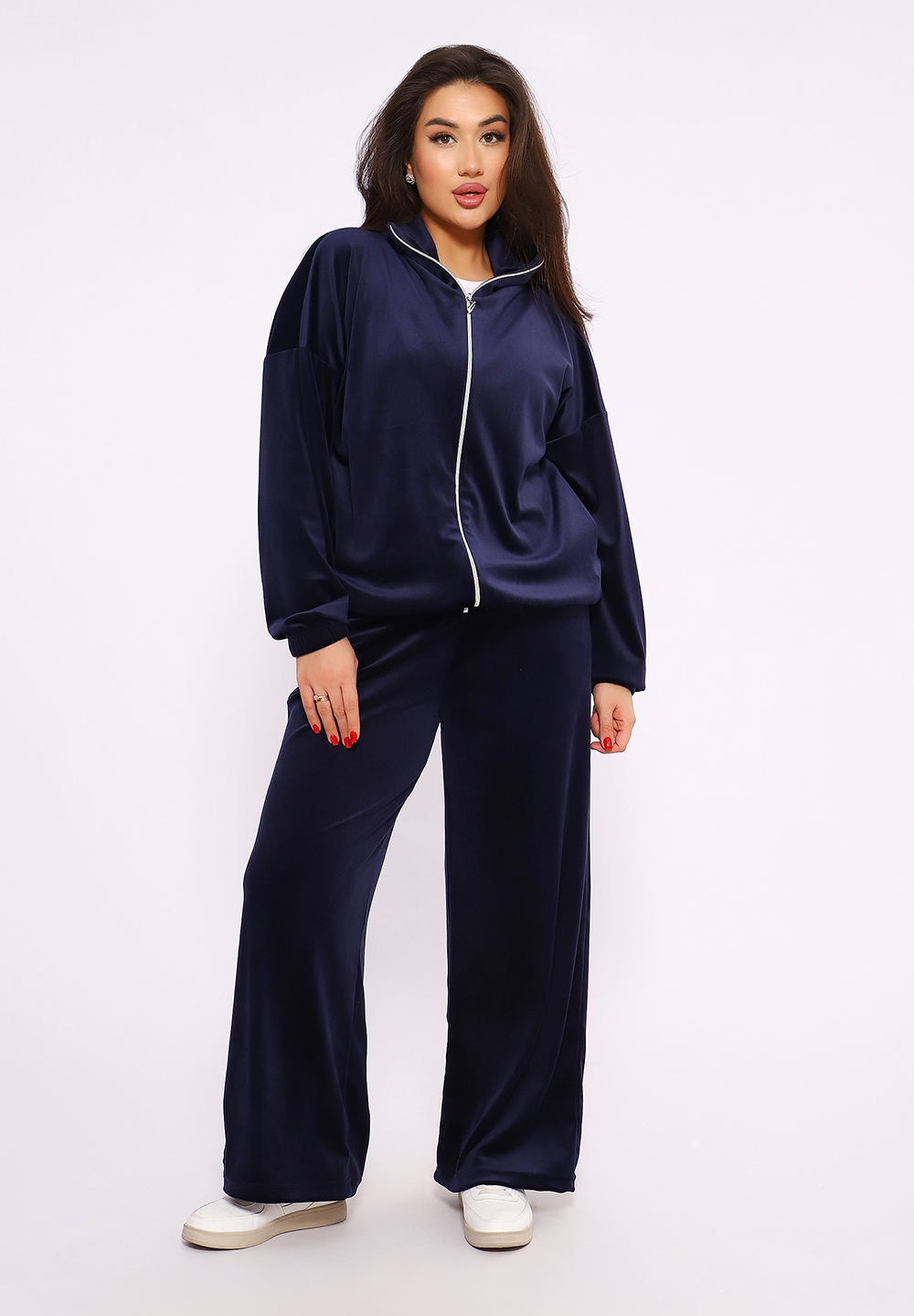 Этот велюровый прогулочный костюм — идеальное сочетание шика «нулевых» и современного комфорта. Мягкая фактура ткани с деликатным переливом делает образ дорогим и уютным одновременно.