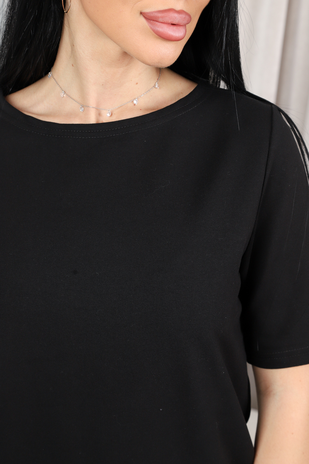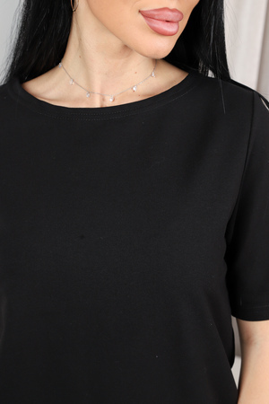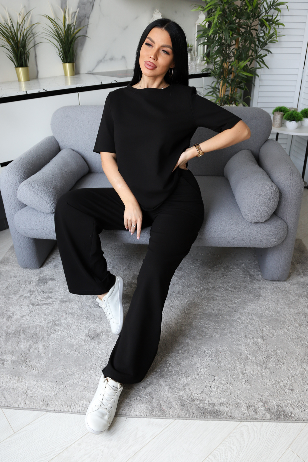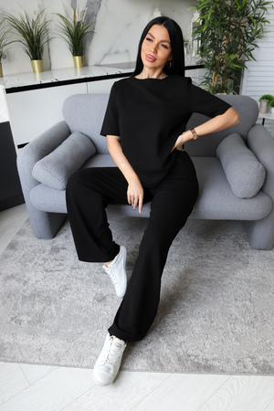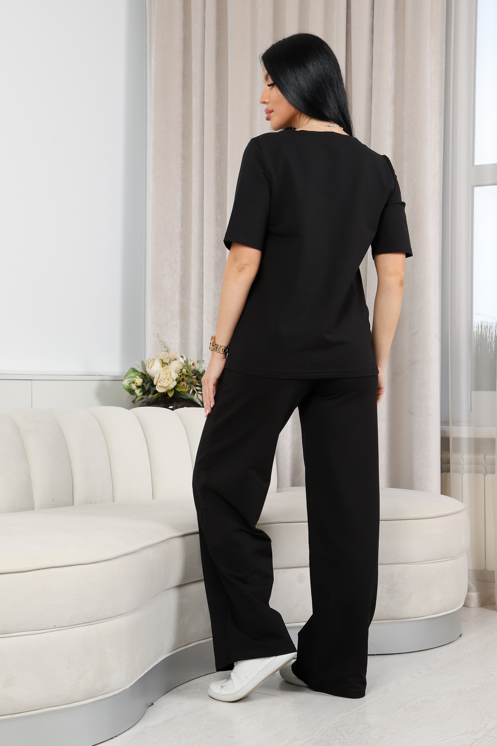 Состав комплекта: Свободная футболка с коротким рукавом и круглым вырезом, а также прямые брюки.