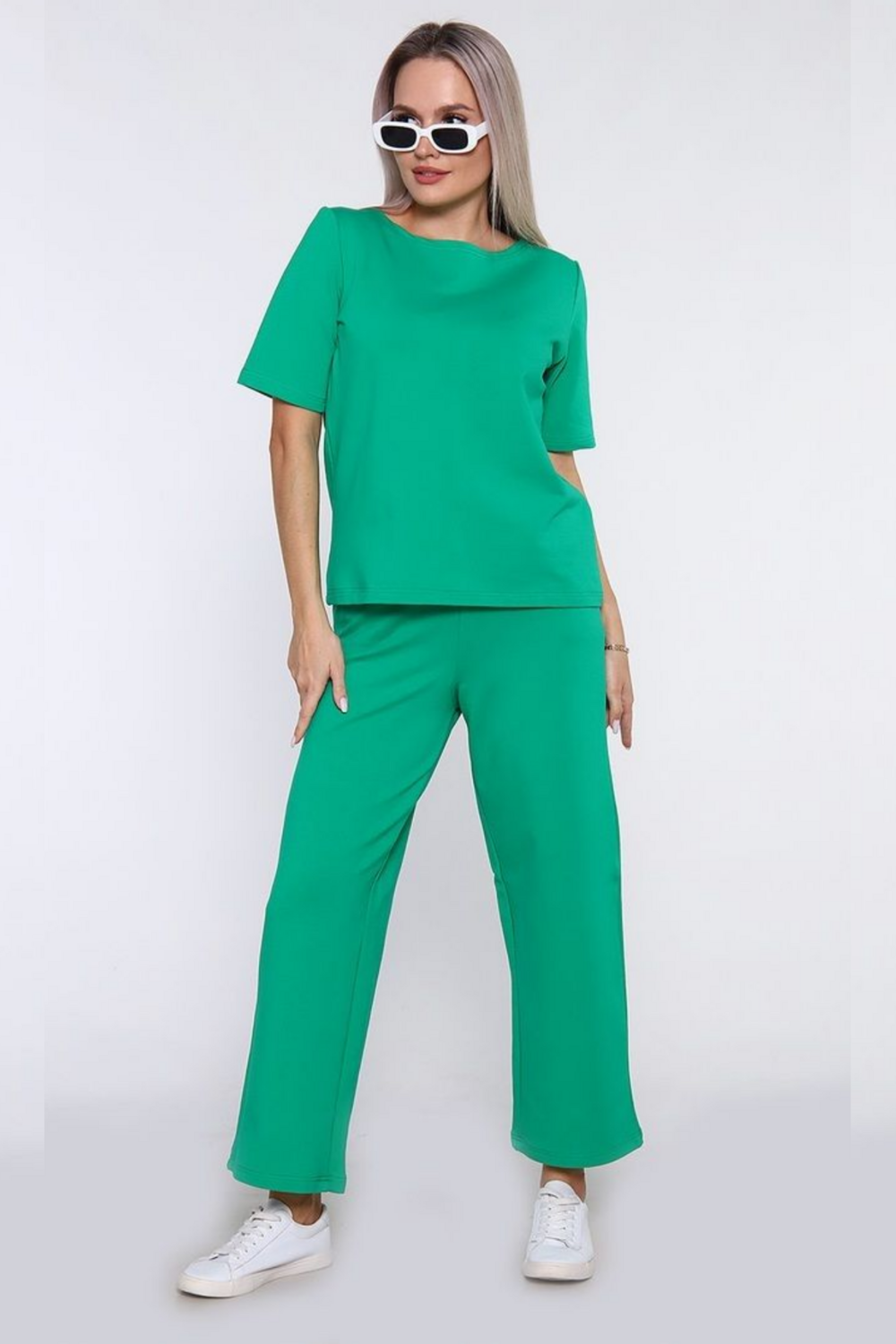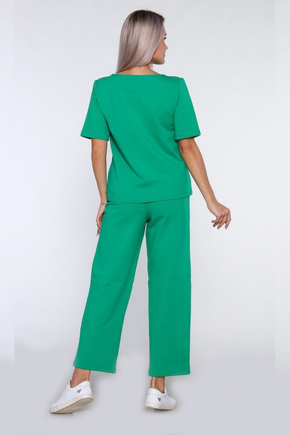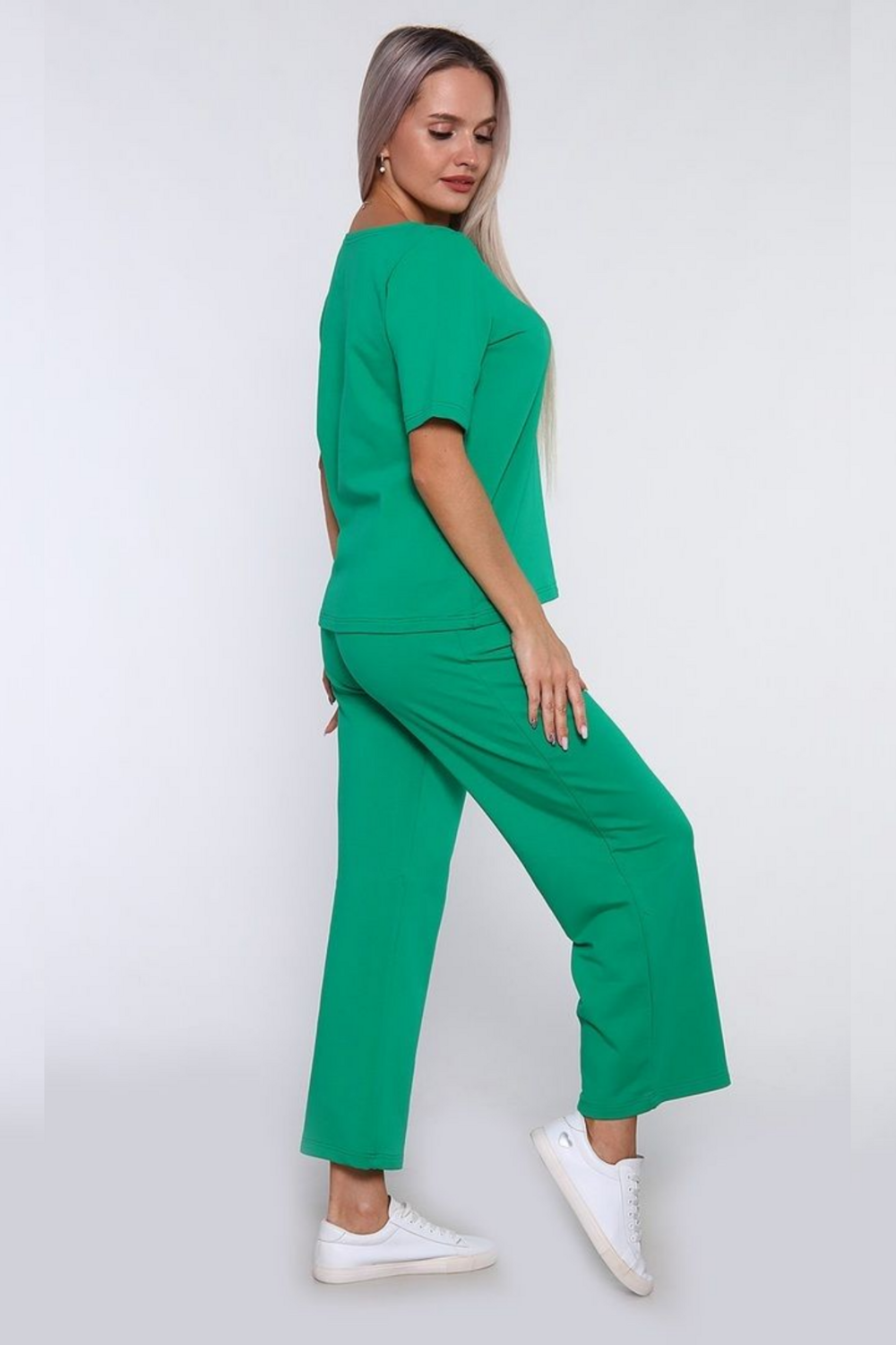 Состав комплекта: Свободная футболка с коротким рукавом и круглым вырезом, а также прямые брюки.
