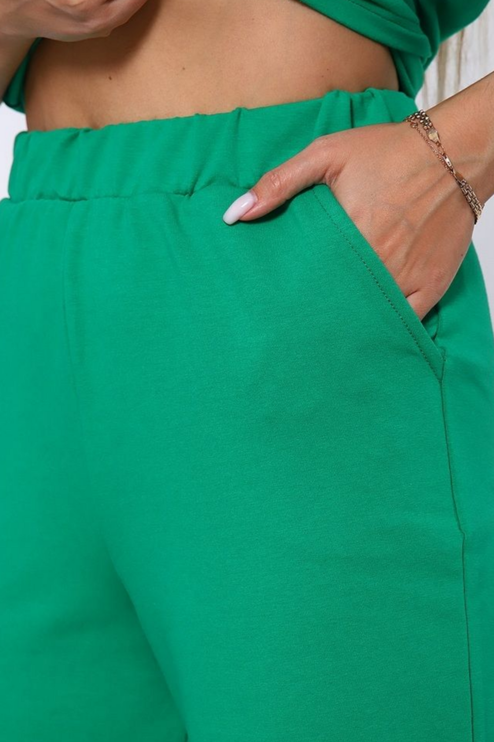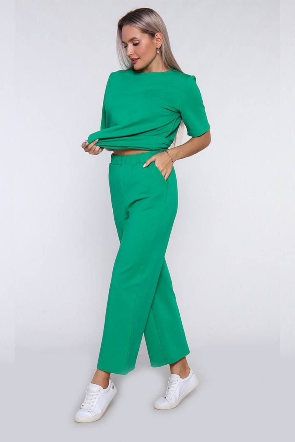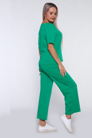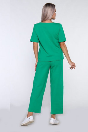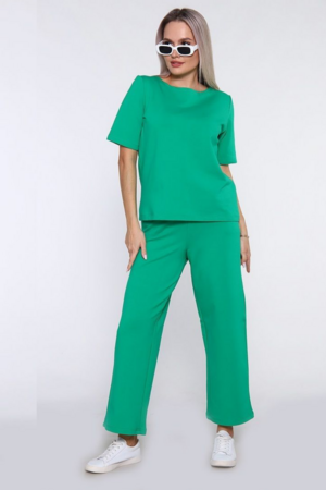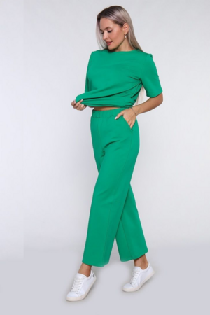 Состав комплекта: Свободная футболка с коротким рукавом и круглым вырезом, а также прямые брюки.
