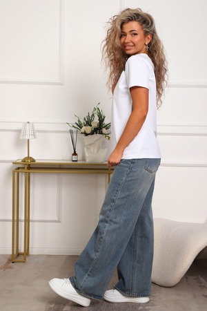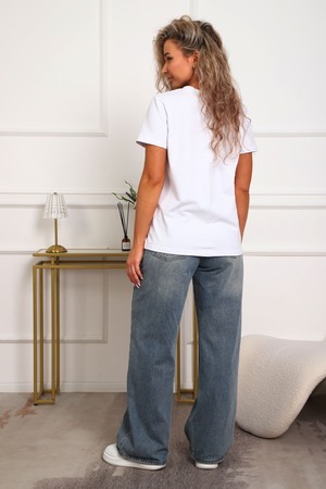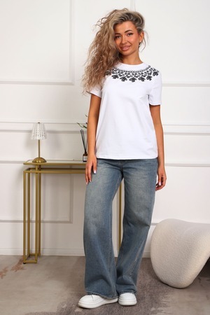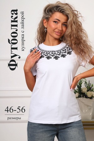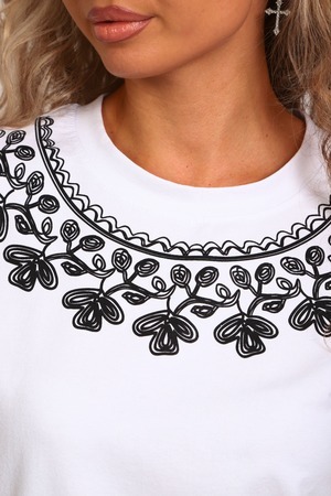 Футболка женская прямого силуэта. Низ изделия прямой. Длинна до середины бедра, плечо на естественном месте, рукав короткий. Горловина круглой формы, обработана планкой . Принт (шелкография пуф) в виде кружевного воротника.