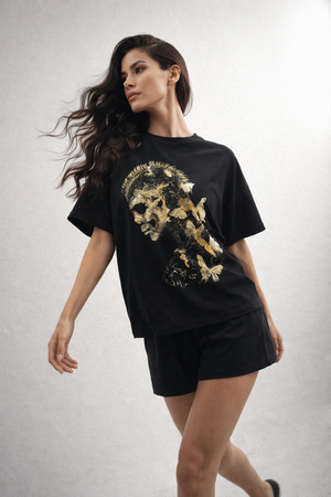 Удобный женский трикотажный костюм с шортами и футболкой свободного кроя отлично подойдет для прогулок, для активного отдыха, походов за покупками, да и просто для дома. Эта модель произведена из качественного хлопка. на футболку нанесен оригинальный принт.