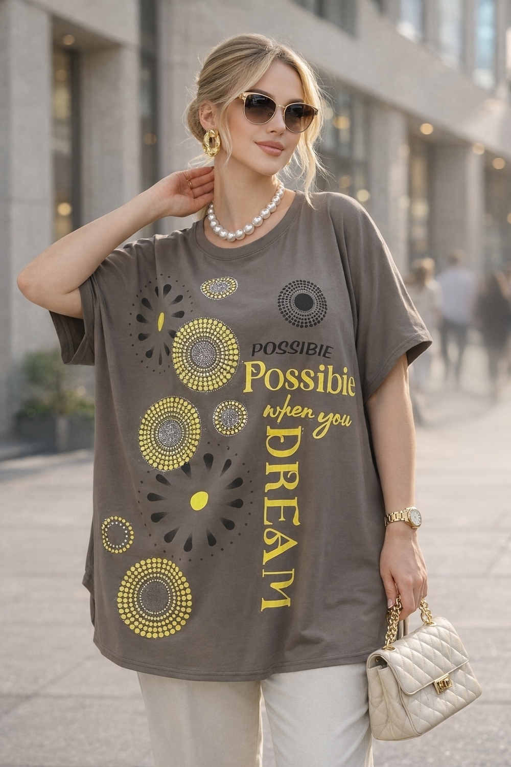 Эта туника — не просто одежда, а вдохновляющее заявление: «Всё возможно, если ты мечтаешь» — так звучит надпись на передней части изделия, гармонично вписанная в яркий, солнечный принт. Артикул F9702 создан для женщин, которые ценят смелость, женственность и утончённую роскошь в каждой детали.