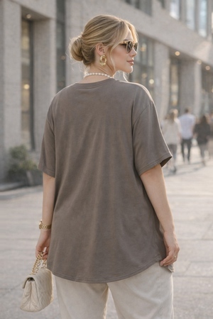 Крой — оверсайз с опущенной линией плеча, что придаёт модели современный, расслабленный силуэт и визуально удлиняет корпус. Такой крой особенно комфортен в повседневной носке и подходит для фигур размеров 58–68 — универсальный размер, который работает благодаря свободному крою и эластичности ткани.