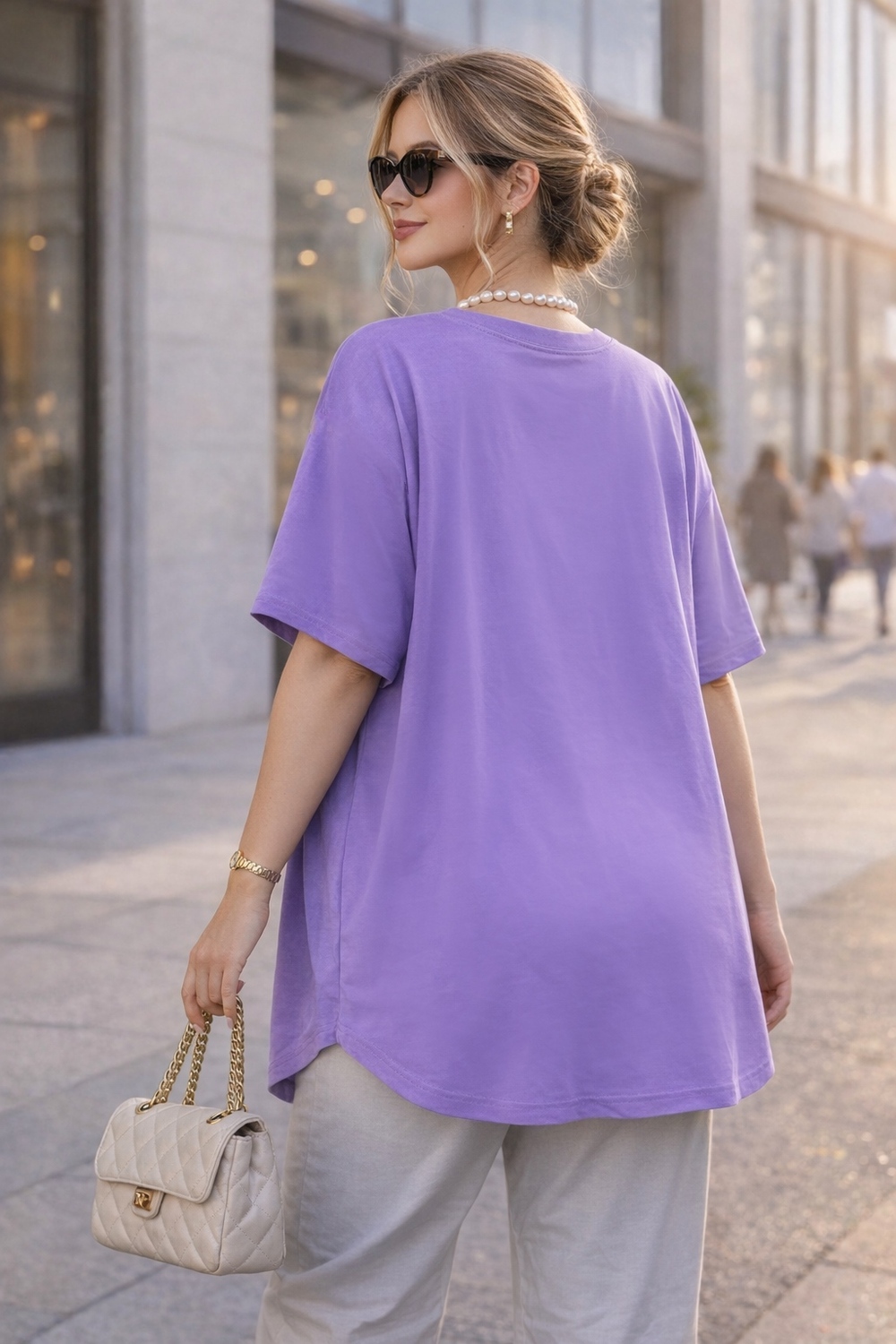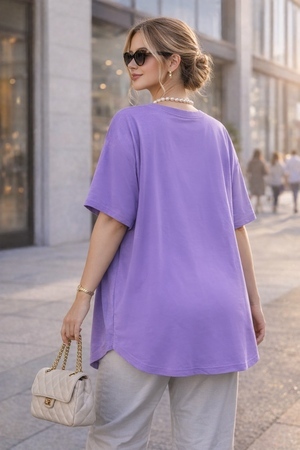 Крой — оверсайз с опущенной линией плеча, что придаёт модели современный, расслабленный силуэт и визуально удлиняет корпус. Такой крой особенно комфортен в повседневной носке и подходит для фигур размеров 58–68 — универсальный размер, который работает благодаря свободному крою и эластичности ткани.