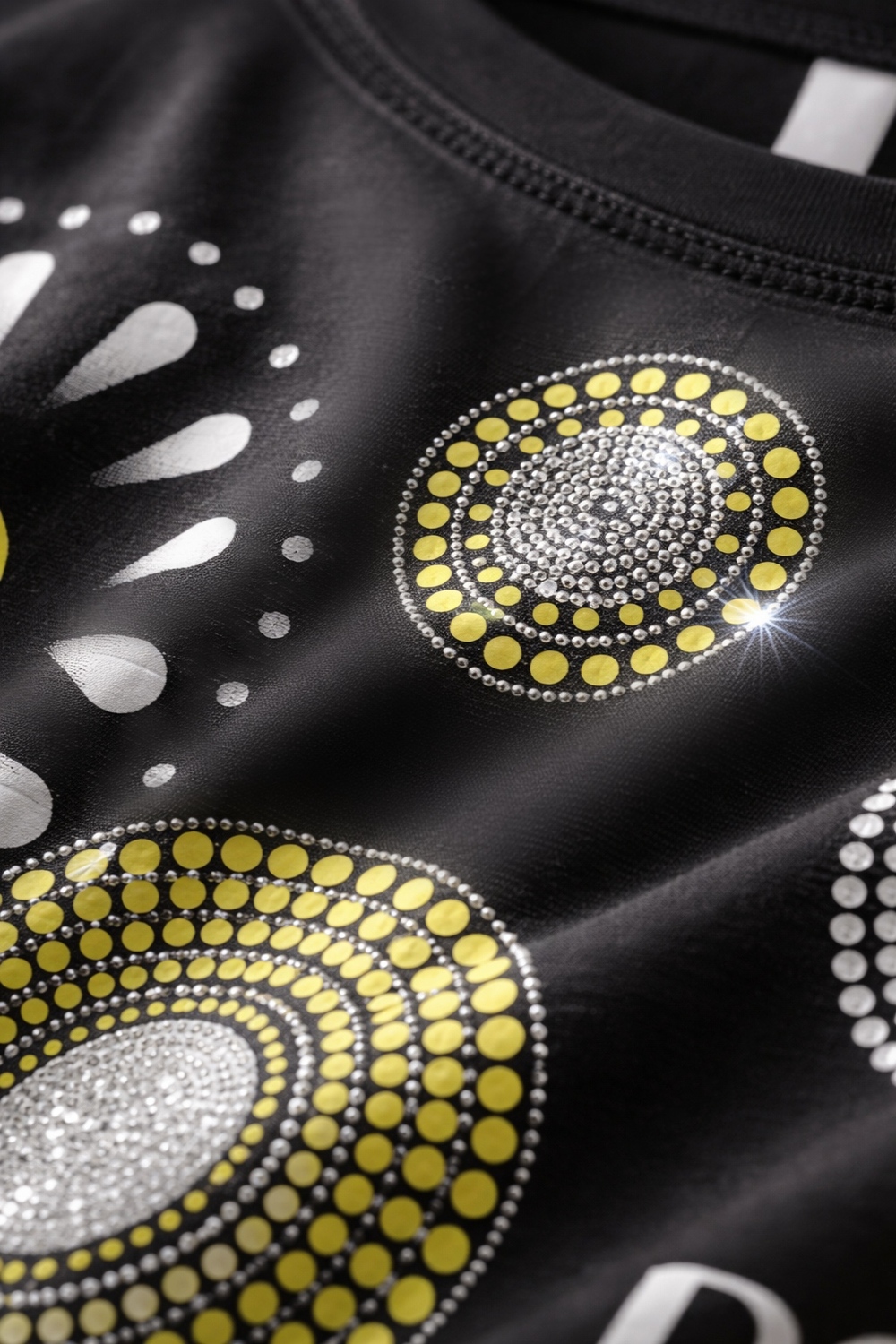 Сияющее впечатление — эффект «солнечного блеска»: по передней части расположены композиции из страз в виде абстрактных цветов и кругов. Стразы переливаются в свете — особенно красиво на солнце, создавая ощущение легкости, радости и внутреннего сияния. Это не просто декор — это энергия, которую вы несёте с собой.
