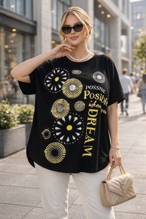 Эта туника — не просто одежда, а вдохновляющее заявление: «Всё возможно, если ты мечтаешь» — так звучит надпись на передней части изделия, гармонично вписанная в яркий, солнечный принт. Артикул F9702 создан для женщин, которые ценят смелость, женственность и утончённую роскошь в каждой детали.