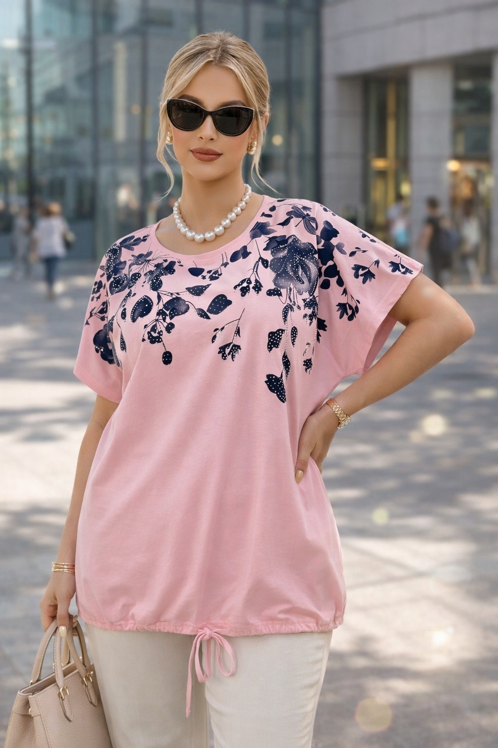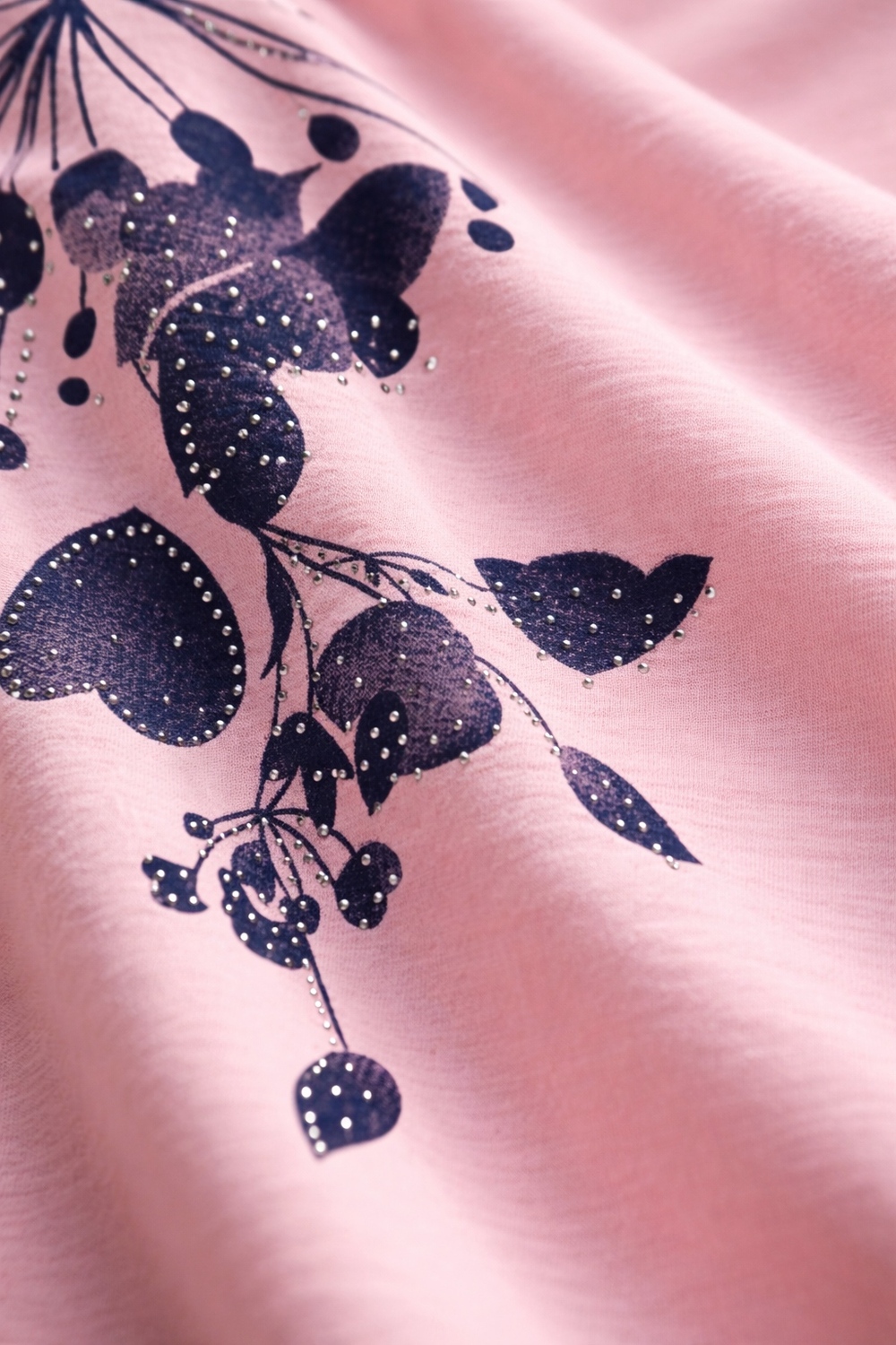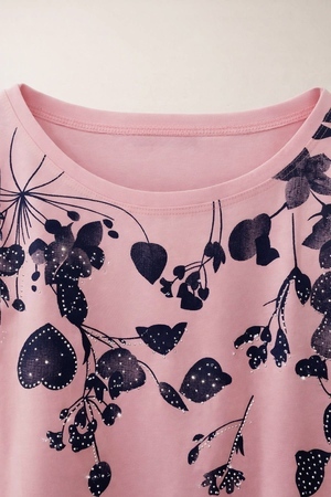 Футболка украшена изысканным цветочным принтом в оттенках синего, дополненным сверкающими стразами. Каждый элемент узора словно оживает на солнце, создавая игру света и бликов, которая привлечет взгляды. Плавные линии цветов и листьев, с аккуратными стразами, придают модели романтичности и шарма. Опущенная линия плеча добавляет современности и обеспечивает комфорт — никаких стягивающих ощущений, только легкость и свобода движений. Благодаря такому крою модель выглядит стильно даже в повседневной обстановке, подчеркивая вашу естественную грацию.