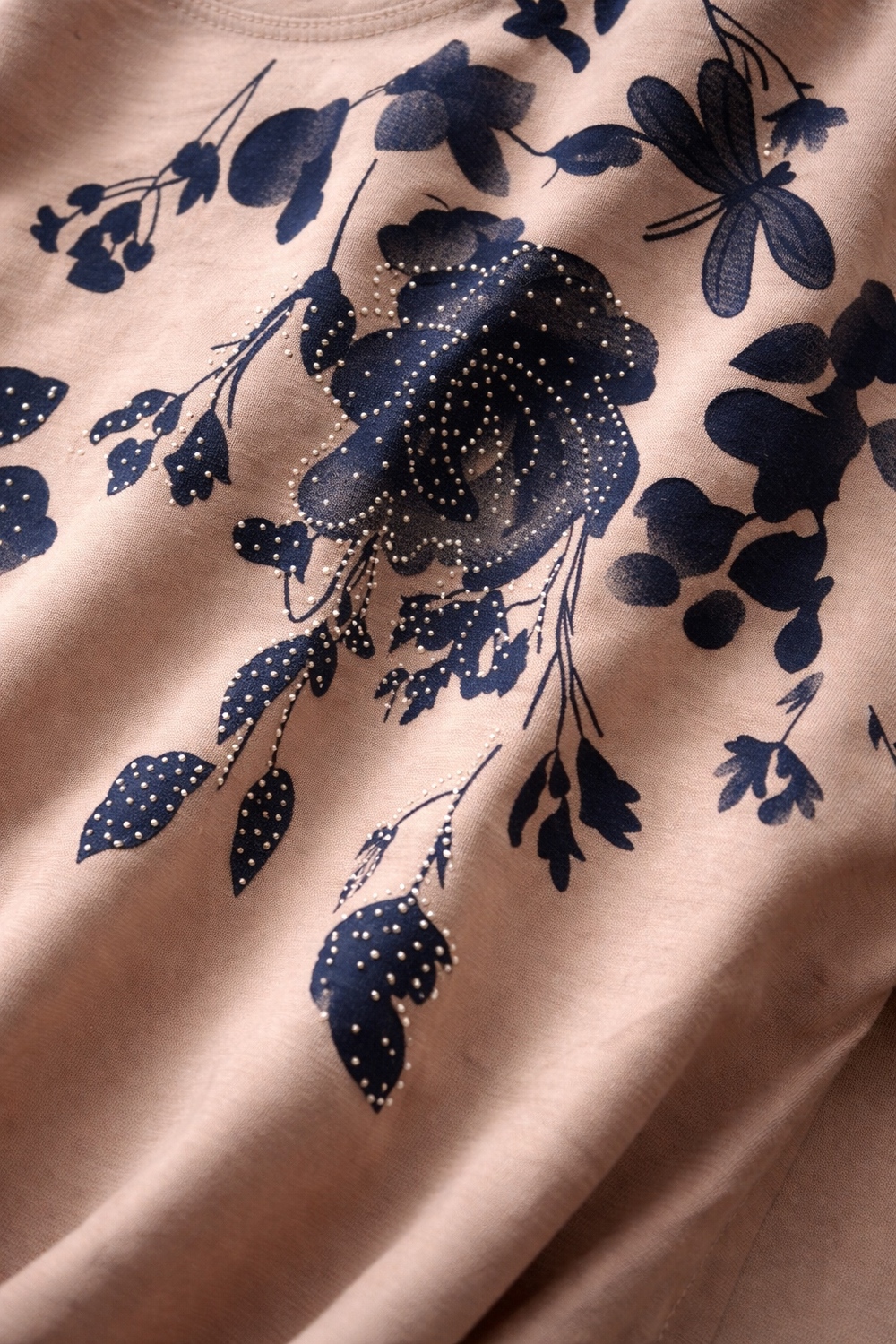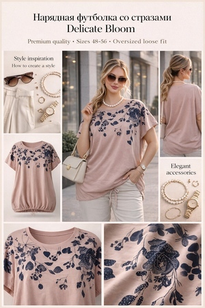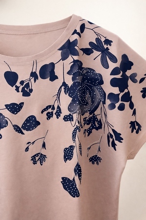 Футболка украшена изысканным цветочным принтом в оттенках синего, дополненным сверкающими стразами. Каждый элемент узора словно оживает на солнце, создавая игру света и бликов, которая привлечет взгляды. Плавные линии цветов и листьев, с аккуратными стразами, придают модели романтичности и шарма. Опущенная линия плеча добавляет современности и обеспечивает комфорт — никаких стягивающих ощущений, только легкость и свобода движений. Благодаря такому крою модель выглядит стильно даже в повседневной обстановке, подчеркивая вашу естественную грацию.