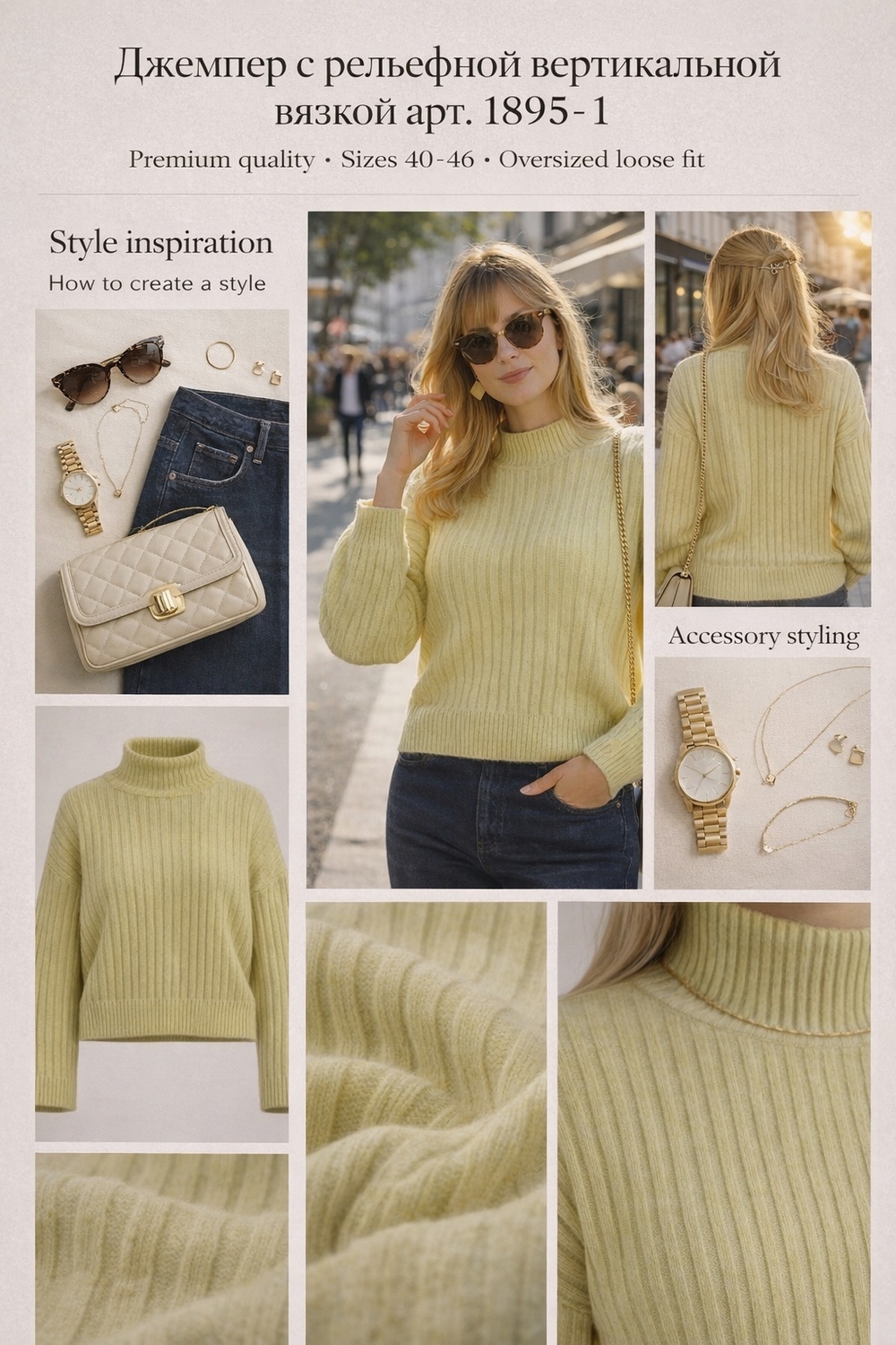 Стильный крой: Свободный силуэт создает эффект легкого оверсайза, который особенно выразителен в средних размерах. В больших размерах (46-48) джемпер сидит более приталенно, сохраняя при этом комфорт.