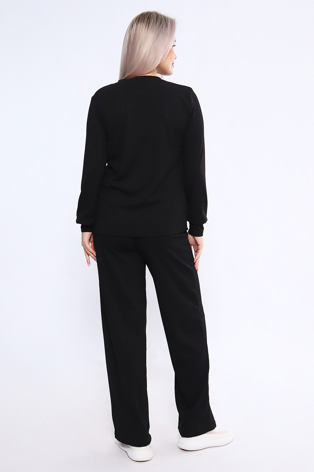 Женский костюм из трикотажа "лапша" (рубчик) состоит из лонгслива с длинными рукавами и манжетами и свободных брюк, выполнен из материала с преобладанием полиэстера (95%) и добавлением спандекса (5%), что обеспечивает комфорт и практичность. Костюм подходит как для повседневного ношения, так и в качестве домашней одежды, и представлен в широком размерном диапазоне от 46 до 60