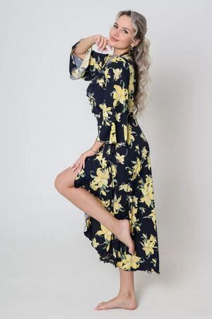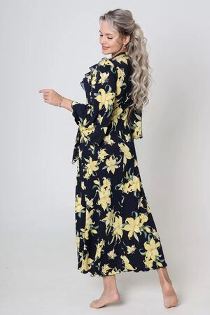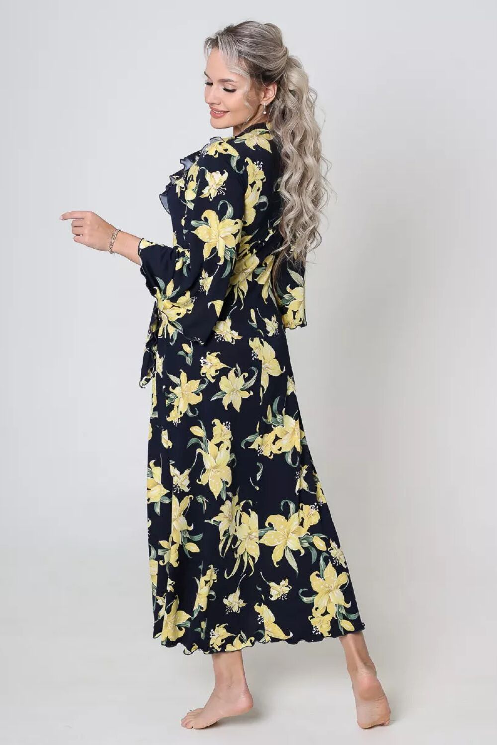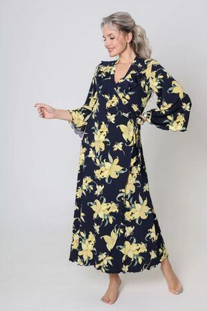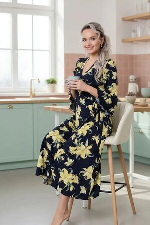 Халат домашний трикотажный женский - это отличное дополнение к вашей коллекции одежды для дома, созданной для тех, кто любит быть яркой и стильной, даже находясь в уютном уголке своего дома. Длинный халат с запахом имеет полуприлегающий силуэт, расклешенный к низу, длиной до середины икры. Линия талии завышена, что создает элегантный и изящный силуэт. На полочках, в области груди, расположены изящные воланы, которые добавляют изюминку к образу, подчеркивая женственность. Рукав в тачной, длиной 3/4, смотрится легко и элегантно, это делает его удобным в использовании. Подойдет как стройным женщинам, так и дамам с пышными формами. Возьмите халатик в роддом и будете самой элегантной мамочкой. Наш халат – это идеальный выбор для приятного времяпрепровождения в уютной обстановке. Сочетая в себе красоту и удобство, он идеально подходит для женщин, которые ценят качество во всем.