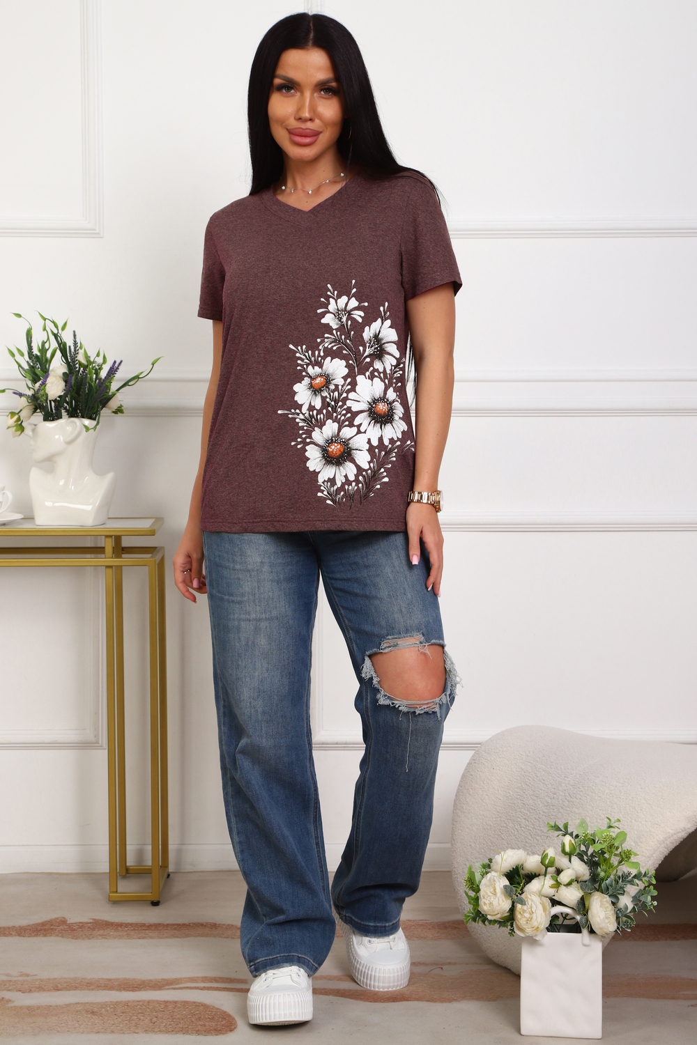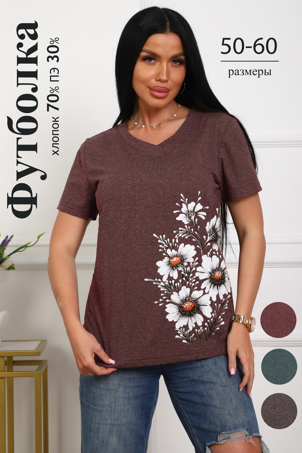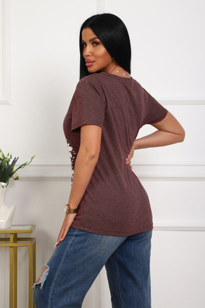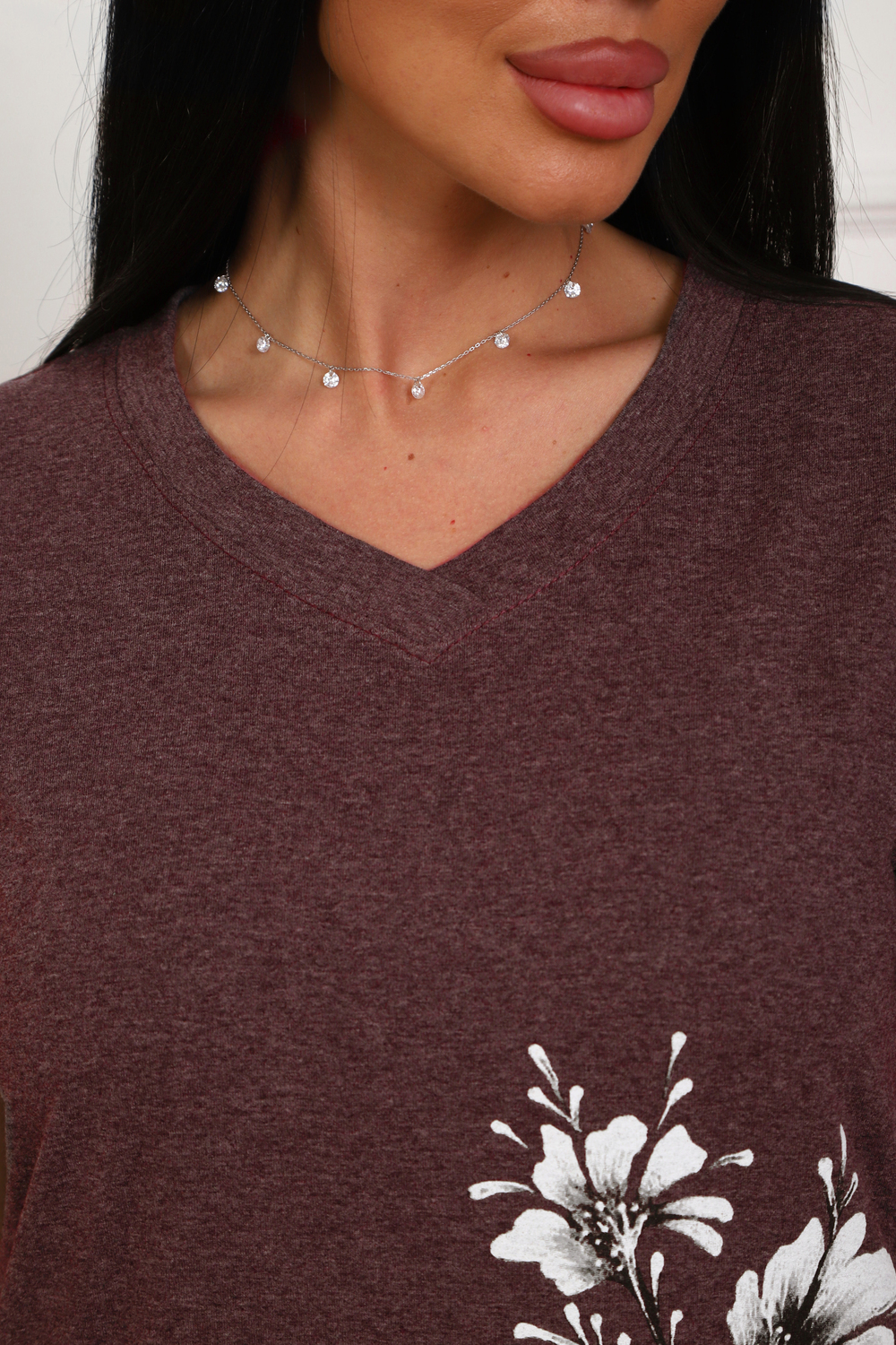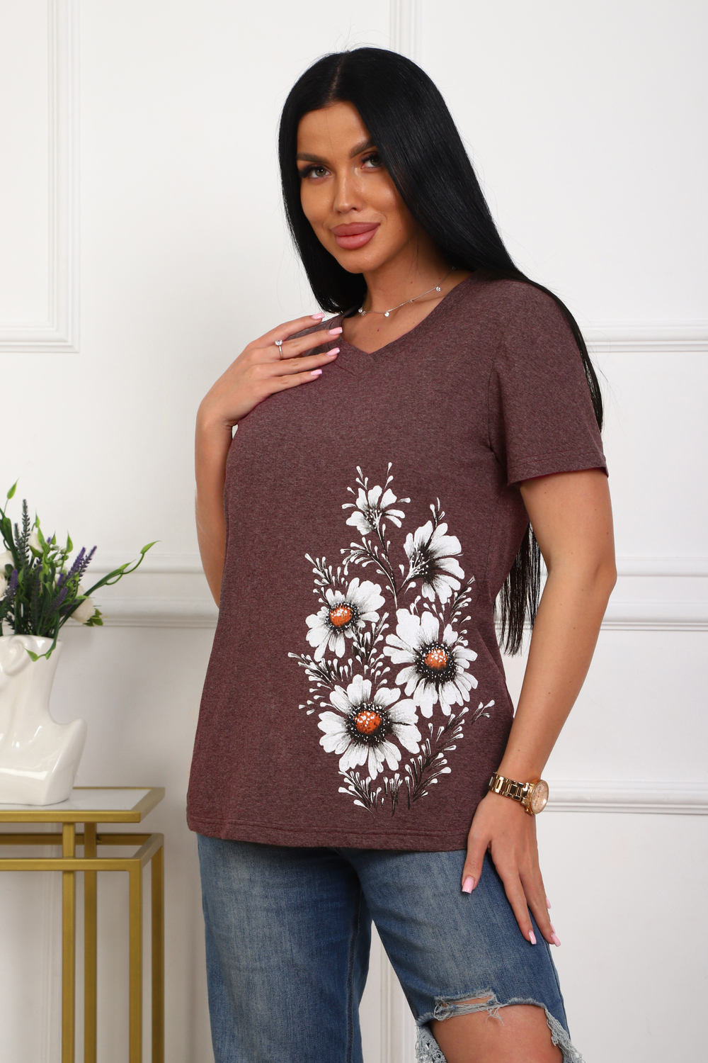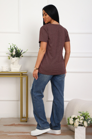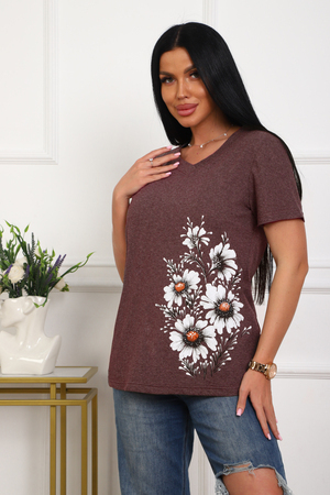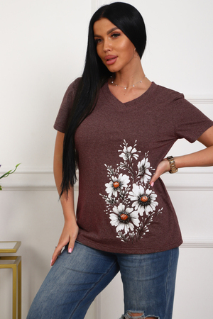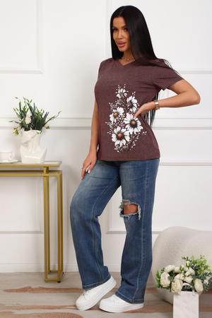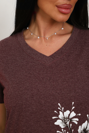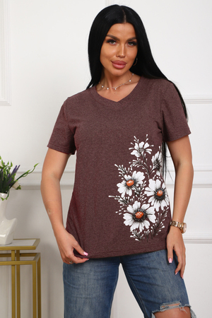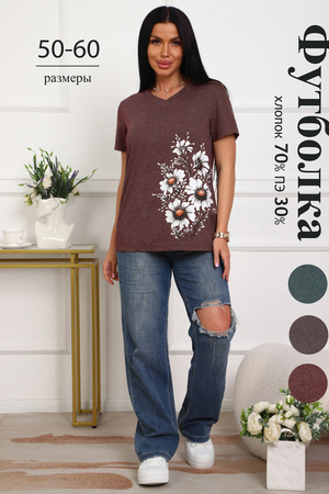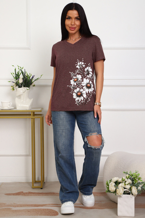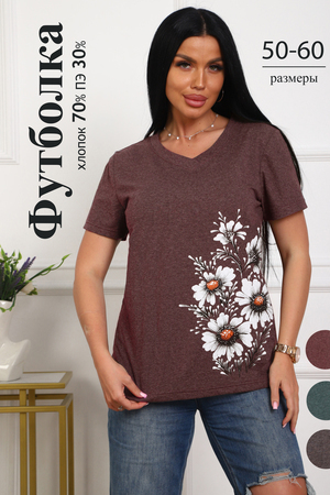 Футболка женская полуприлегающего силуэта из меланжированного трикотажа. Низ изделия прямой. Длинна до середины бедра, плечо на естественном месте, рукав короткий. Горловина V-образной формы, обработана планкой . Принт (шелкография ) на полочке с левой стороны .
