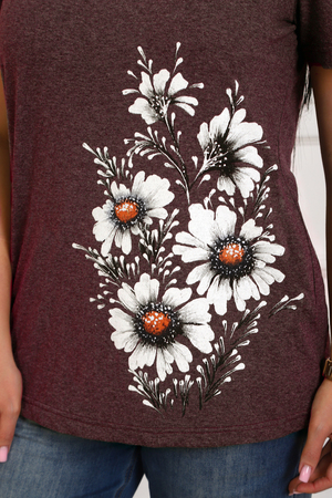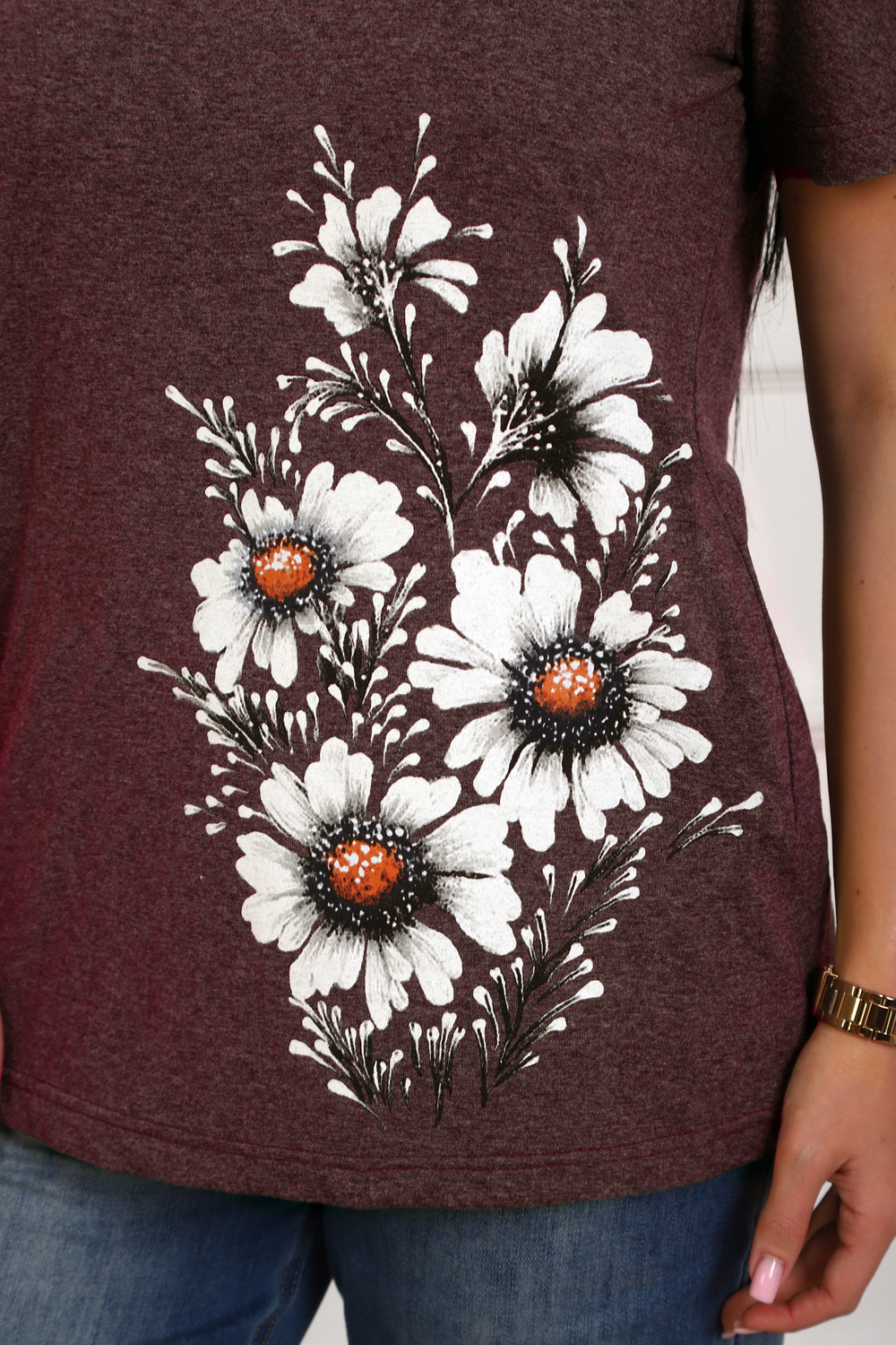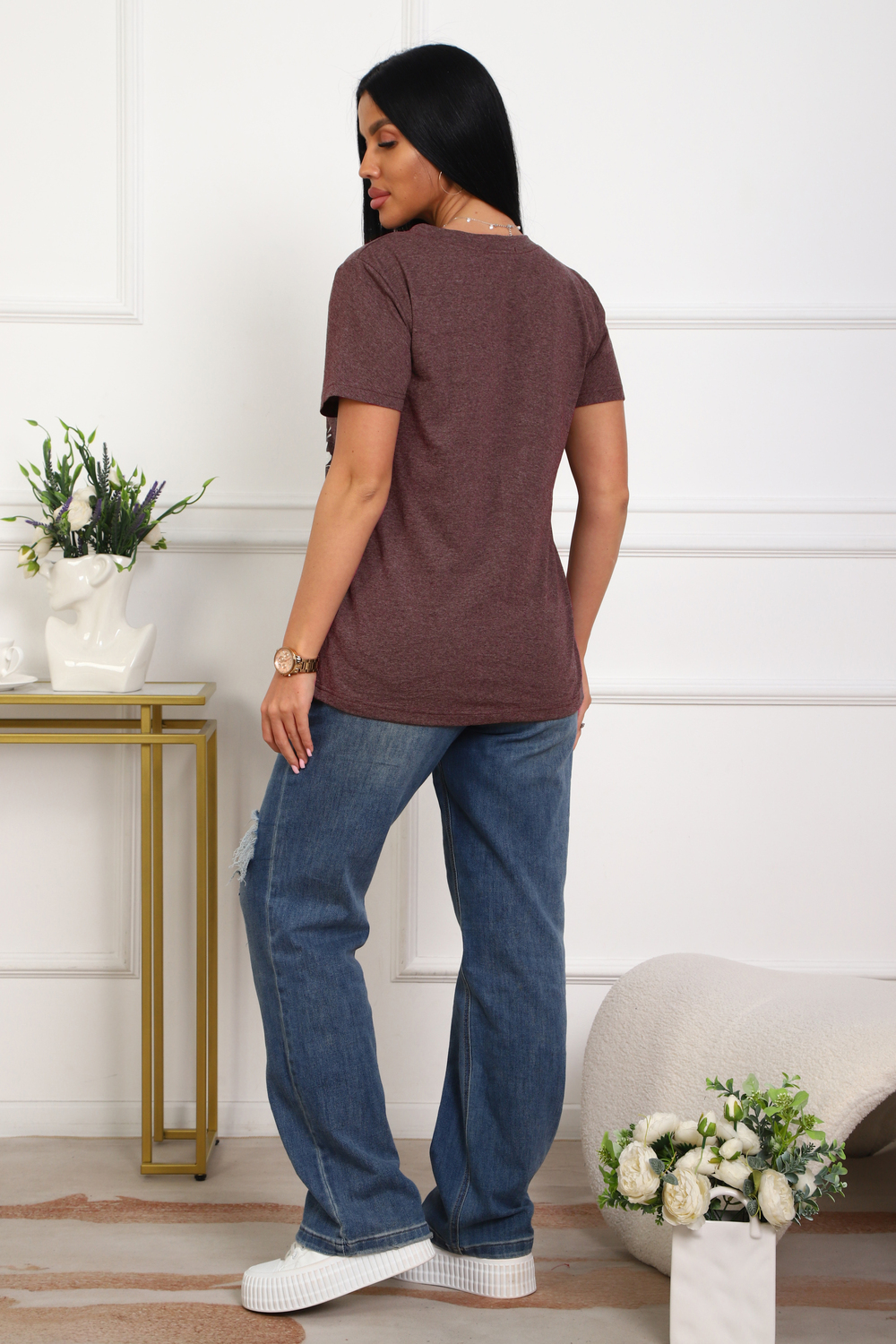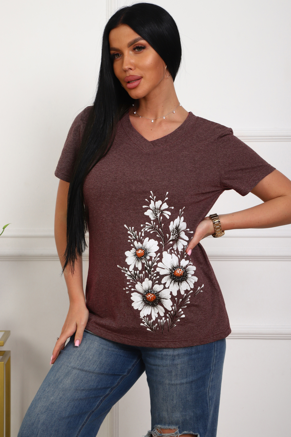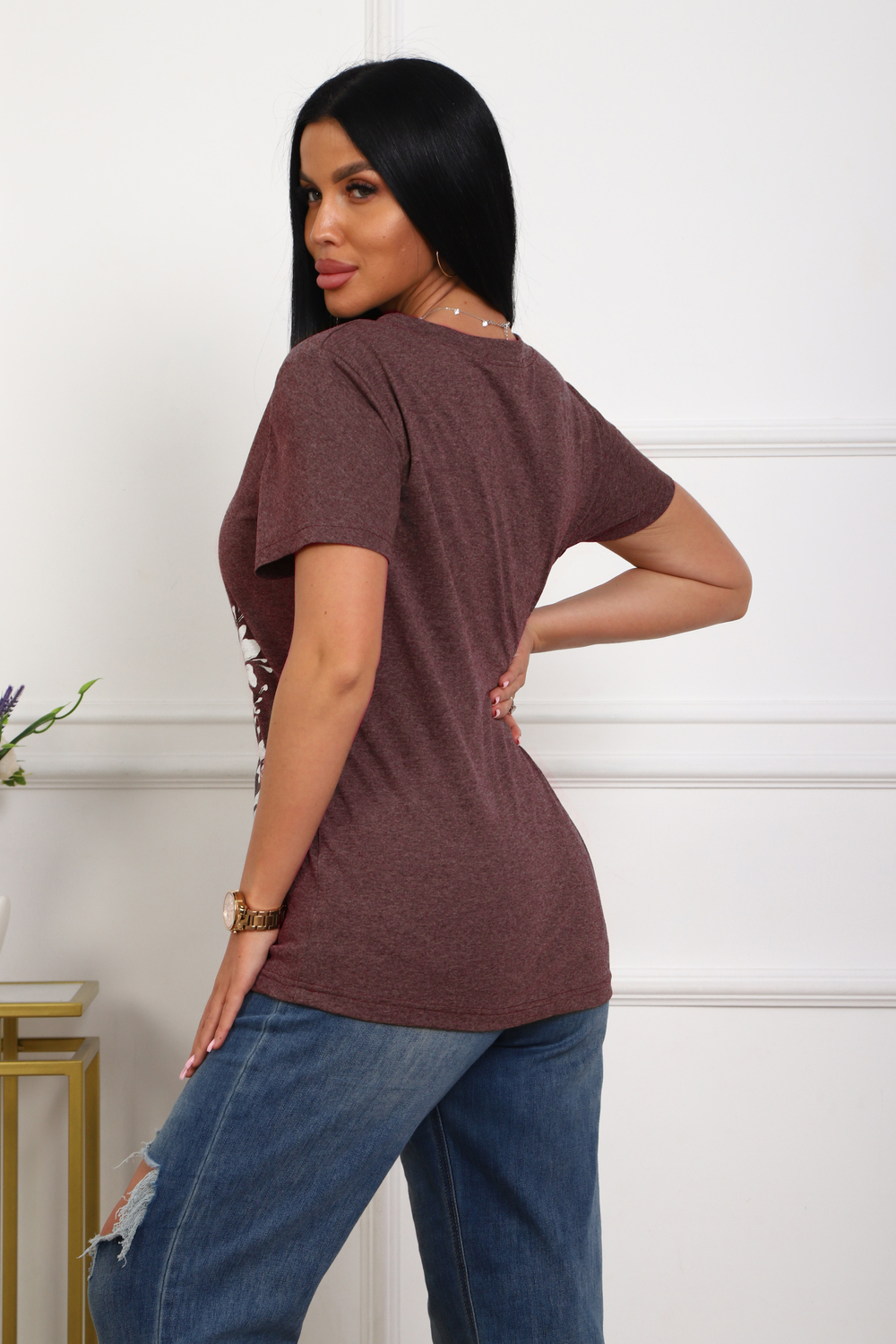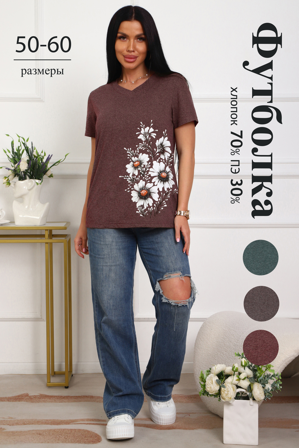 Футболка женская полуприлегающего силуэта из меланжированного трикотажа. Низ изделия прямой. Длинна до середины бедра, плечо на естественном месте, рукав короткий. Горловина V-образной формы, обработана планкой . Принт (шелкография ) на полочке с левой стороны .