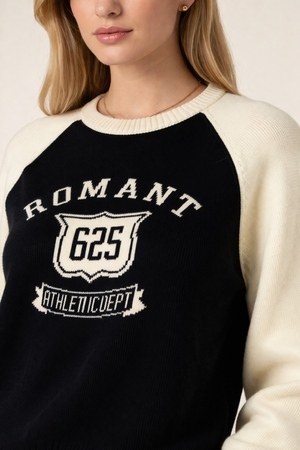 На груди расположена вязка в винтажном стиле: арочная надпись ROMANT, под которой находится стилизованная эмблема в форме щита с цифрами 625, и завершает композицию надпись ATHLETIC DEPT на декоративной ленте. Такой принт отсылает к эстетике студенческого спорта 60-х годов и добавляет изделию особый шарм ретро-атлетики.