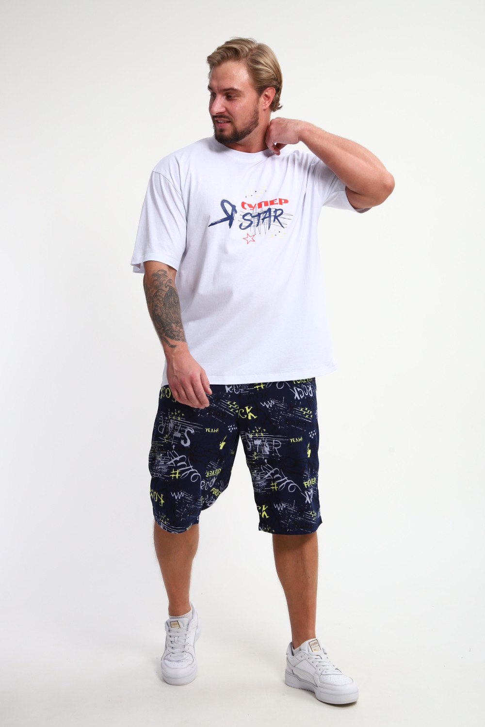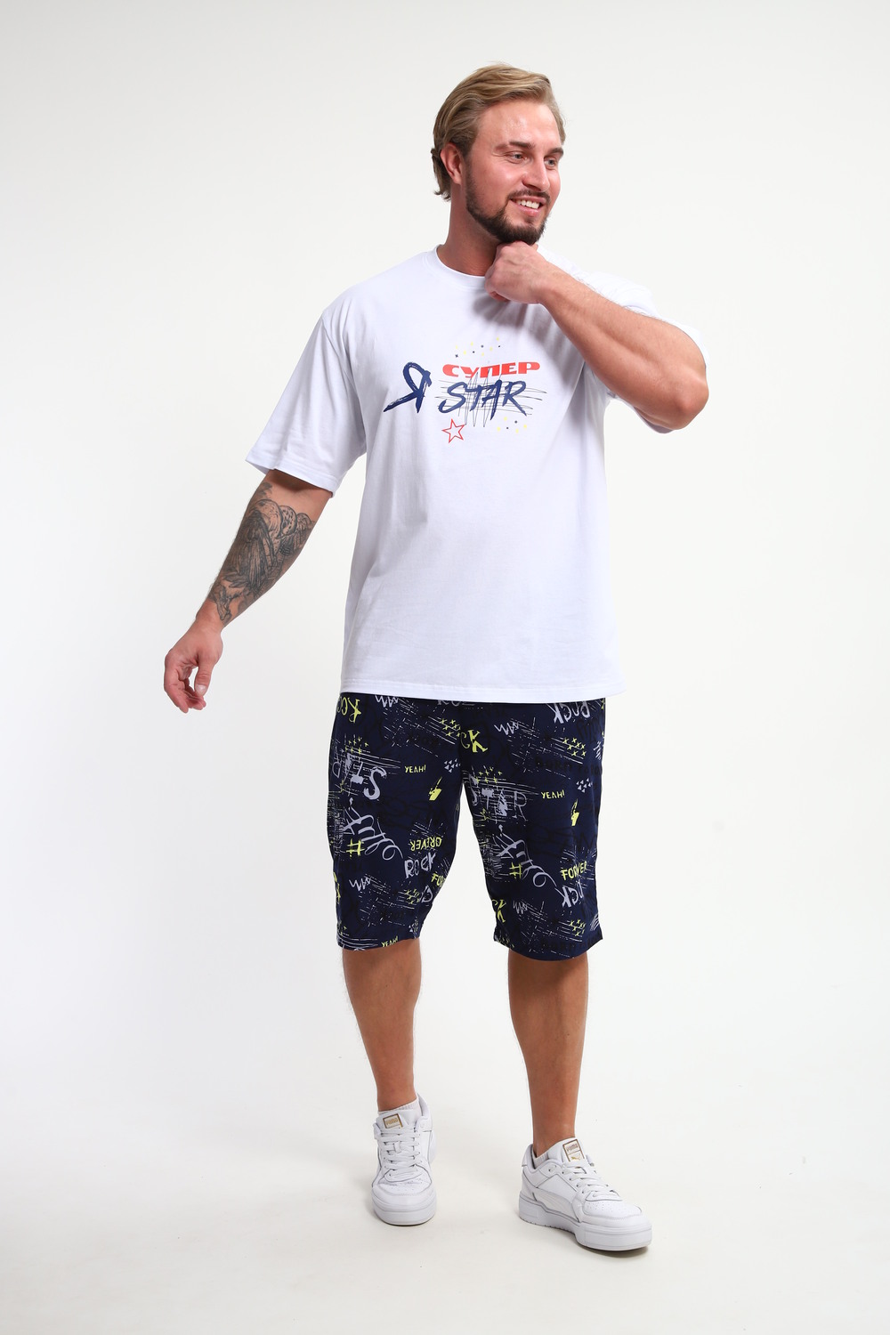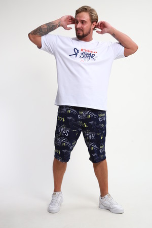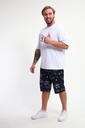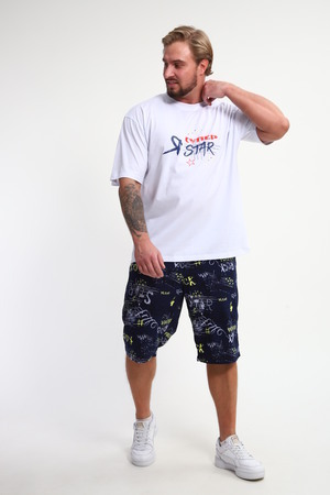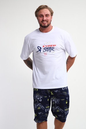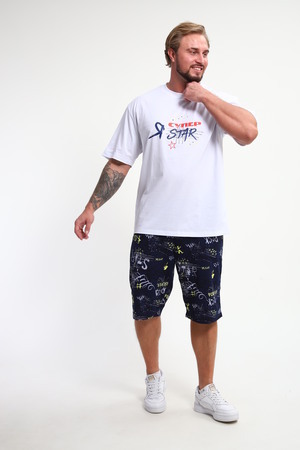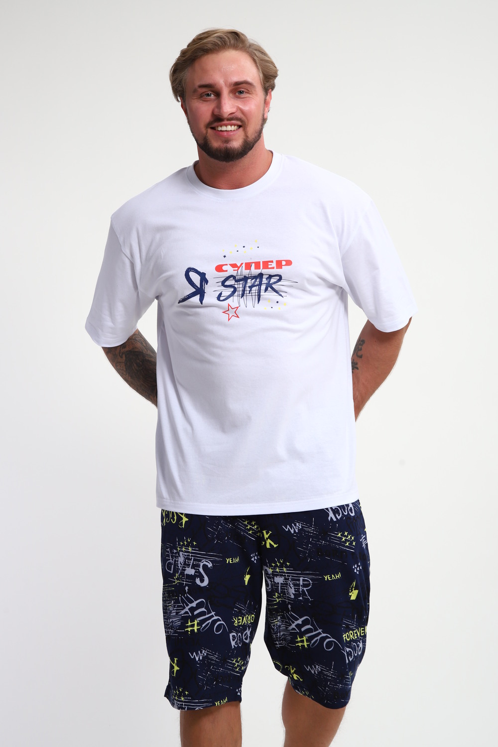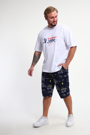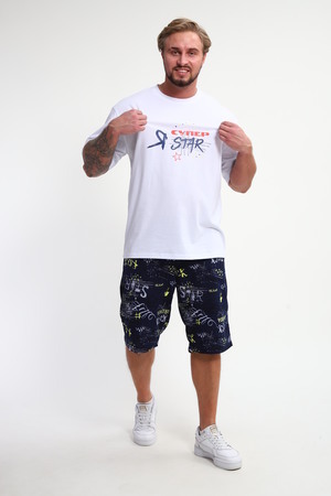 Мужской домашний костюм "Супер стар" от JEXY - это идеальный выбор для мужчин, ценящих комфорт и стиль. Этот стильный спортивный комплект, состоящий из белой футболки с веселым прикольным юморным принтом "Я супер стар" и шорт, сшит из 100% хлопка, что делает его невероятно мягким и приятным к телу.  Прямой покрой и средняя посадка обеспечивают свободу движений, а короткие рукава футболки и шорты,  идеально подходят для теплой погоды.  Яркий принт  "Я Супер стар" добавляет домашнему костюму индивидуальности, делая его отличным выбором для повседневной носки весной и летом.  Костюм "Я Супер стар" - это отличный подарок для любимых мужчин (сыну, брату, мужу, парню, папе, дедушке, другу)  на любой праздник, будь то 23 февраля, День защитника отечества или День всех влюбленных, или День рождения.