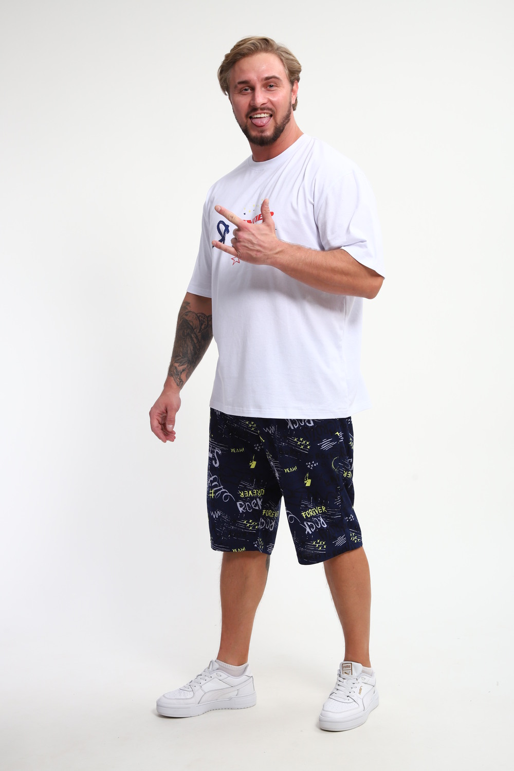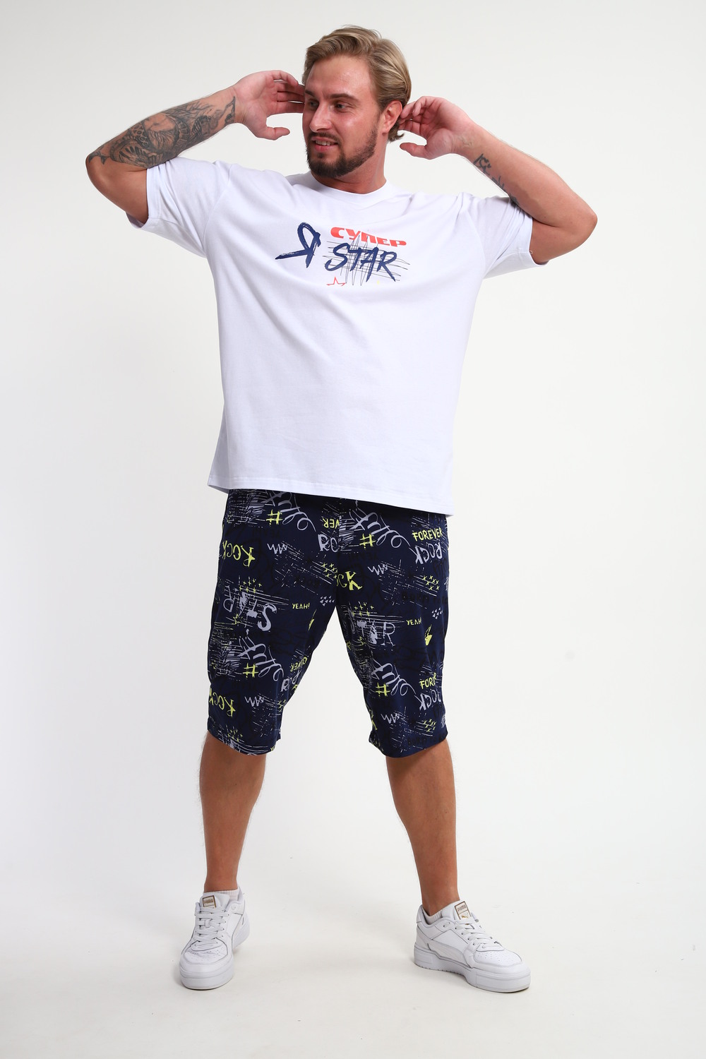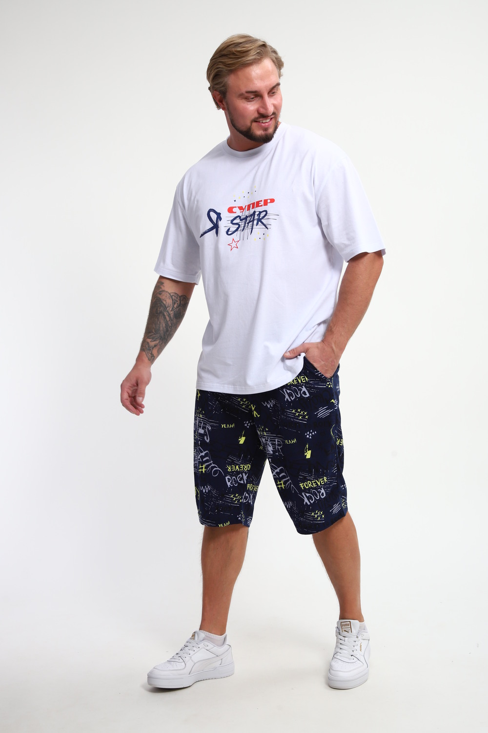 Мужской домашний костюм "Супер стар" от JEXY - это идеальный выбор для мужчин, ценящих комфорт и стиль. Этот стильный спортивный комплект, состоящий из белой футболки с веселым прикольным юморным принтом "Я супер стар" и шорт, сшит из 100% хлопка, что делает его невероятно мягким и приятным к телу.  Прямой покрой и средняя посадка обеспечивают свободу движений, а короткие рукава футболки и шорты,  идеально подходят для теплой погоды.  Яркий принт  "Я Супер стар" добавляет домашнему костюму индивидуальности, делая его отличным выбором для повседневной носки весной и летом.  Костюм "Я Супер стар" - это отличный подарок для любимых мужчин (сыну, брату, мужу, парню, папе, дедушке, другу)  на любой праздник, будь то 23 февраля, День защитника отечества или День всех влюбленных, или День рождения.