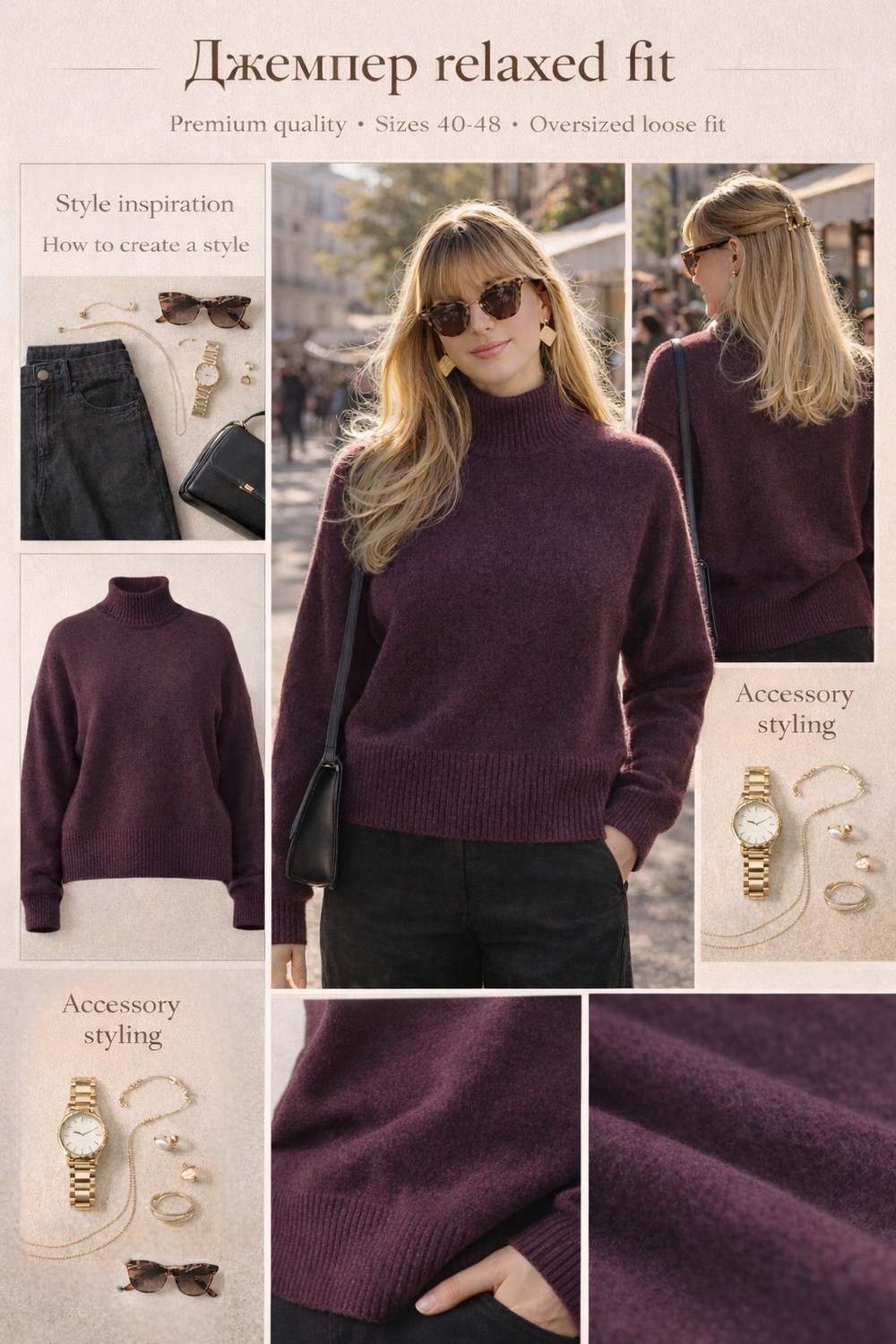 Материал «эко-кашемир» — это современная альтернатива натуральному кашемиру. Мягкая, шелковистая пряжа приятна к телу, абсолютно не колется и не вызывает раздражения даже у обладательниц чувствительной кожи. Джемпер можно носить на голое тело, наслаждаясь невероятной мягкостью и теплом. Материал отлично сохраняет тепло, при этом дышит и не создает парникового эффекта.