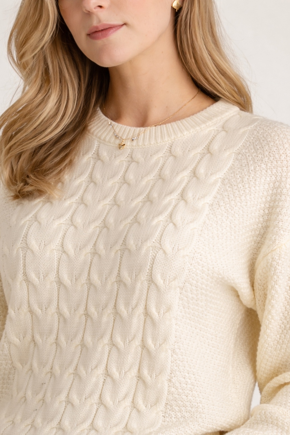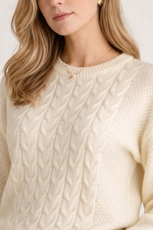 Дизайн: Джемпер украшен объемным узором из кос на передней части изделия — это классический элемент вязаной моды, который никогда не выходит из трендов. Косы создают фактурный рельеф, добавляя изделию элегантности и визуального объема. Рукава и спинка выполнены более легкой ажурной вязкой, что создает гармоничный баланс и не перегружает силуэт.