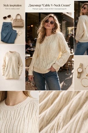 Дизайн: Джемпер украшен объемным фактурным узором из кос по всей поверхности изделия — это классический элемент вязаной моды, создающий элегантный рельеф и визуальный объем. V-образный вырез горловины добавляет образу женственности и изящества, визуально удлиняя шею и создавая flattering силуэт.