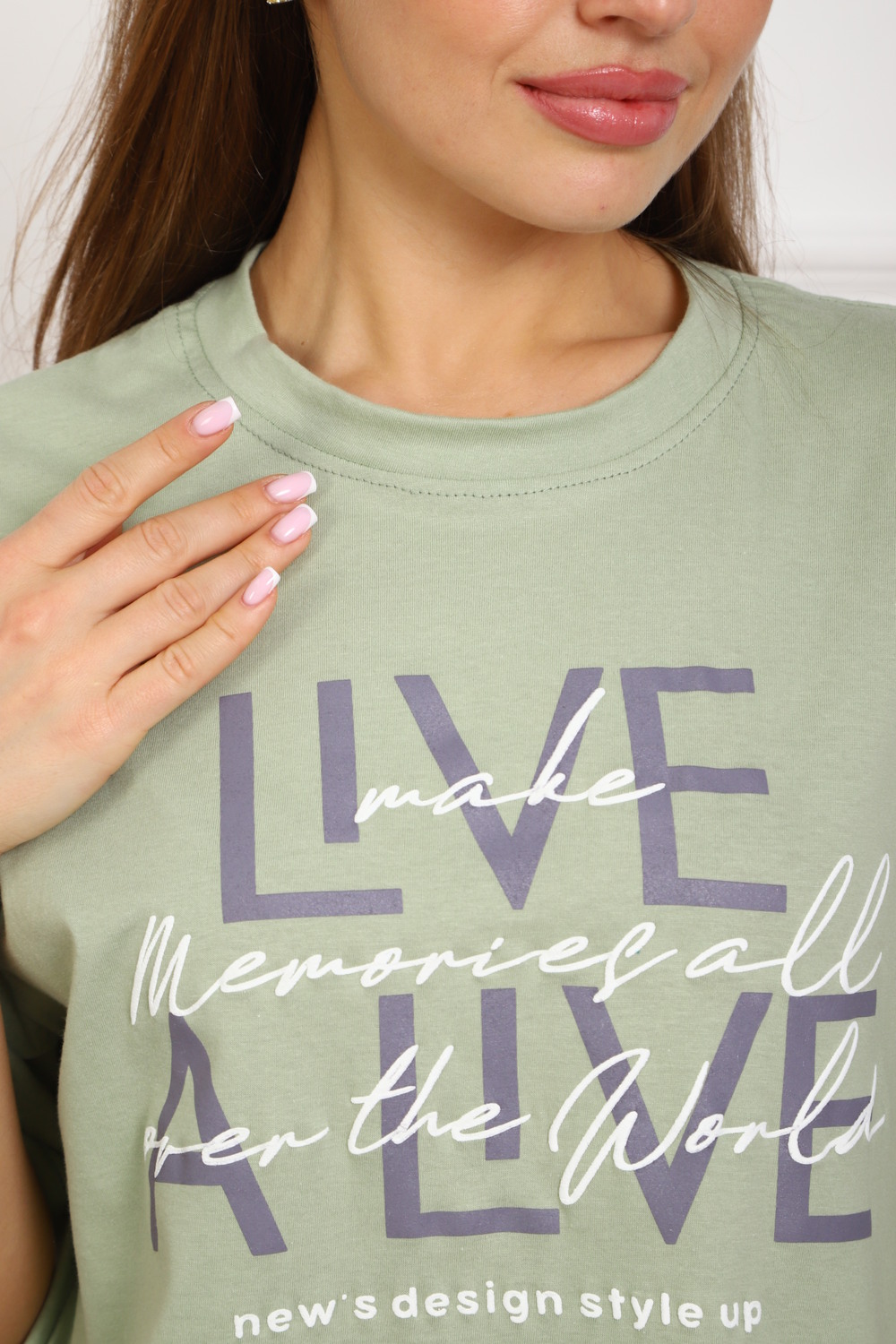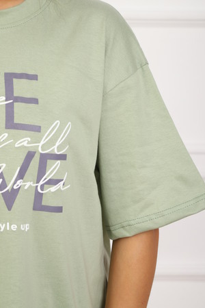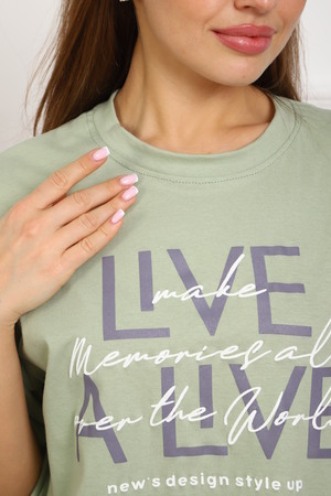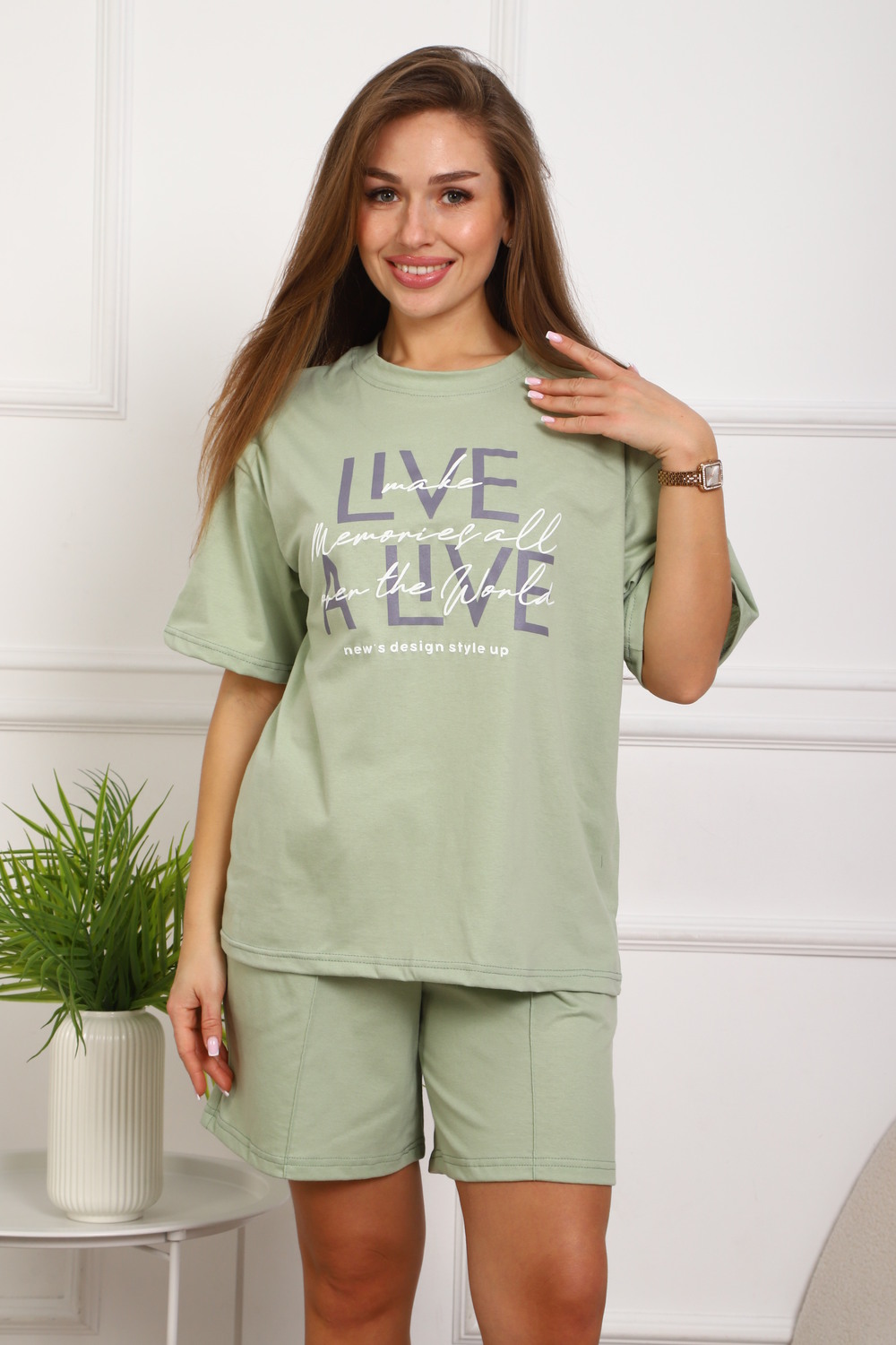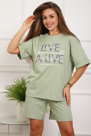 Костюм женский, выполнен из трикотажного полотна кулирка. Костюм состоит из футболки и шорт. Шорты с карманами, со строчкой на передней части полочки вдоль. Футболка свободного силуэта, вточная горловина, на полочке выполнена печать.