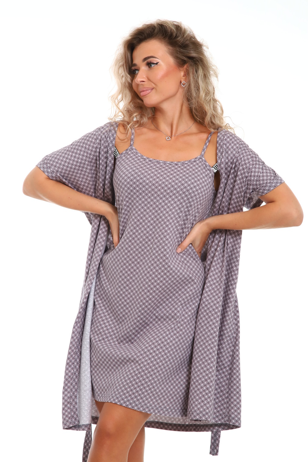 Представляем вам изысканный комплект из халата и сорочки, выполненный из 100% хлопка, который подарит вам комфорт и стиль в любое время дня. Халат на запах с поясом идеально сидит по фигуре и позволяет регулировать объем, создавая утонченный силуэт. Удобные боковые карманы добавляют практичности и делают халат идеальным вариантом для домашнего отдыха и утренних ритуалов. Сорочка на бретельках легкая и воздушная, идеально дополняет образ, обеспечивая максимальный комфорт во время сна или отдыха. Этот комплект станет отличным выбором для тех, кто ценит качество и элегантность. Наслаждайтесь уютом и стилем в каждом моменте с нашим халатом и сорочкой.