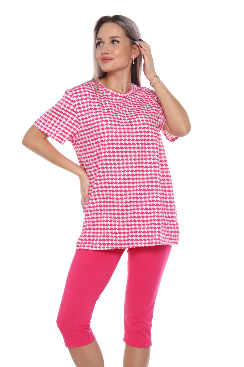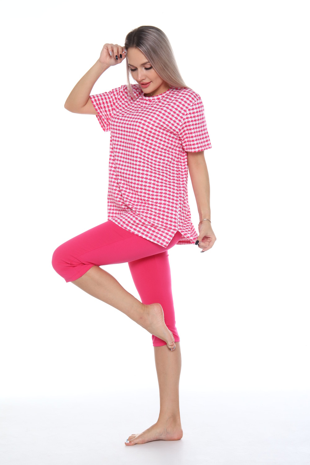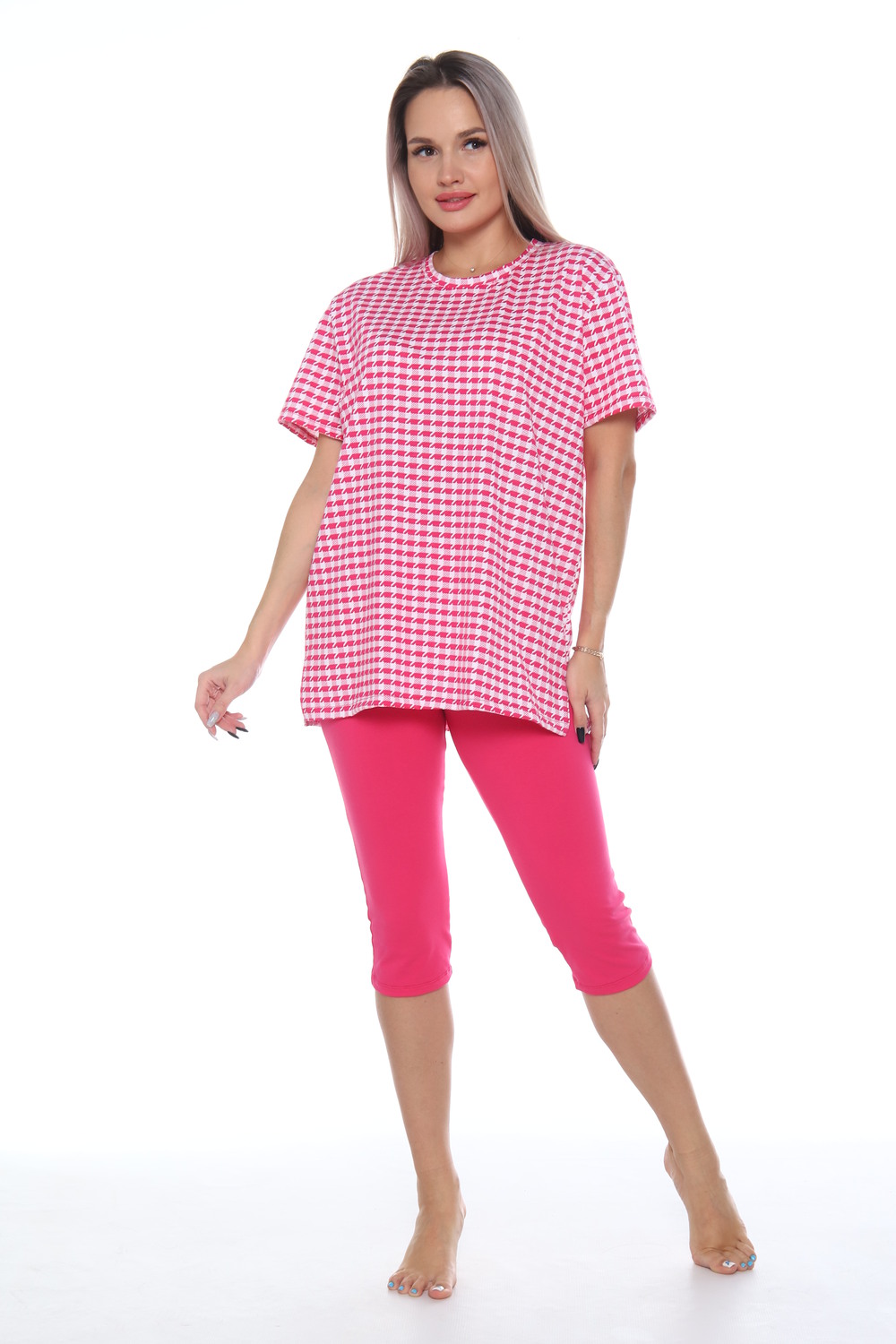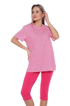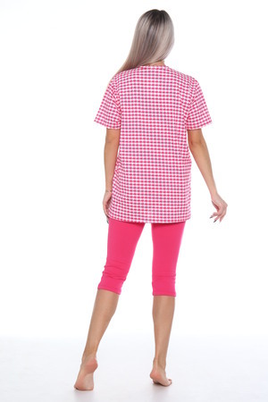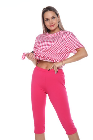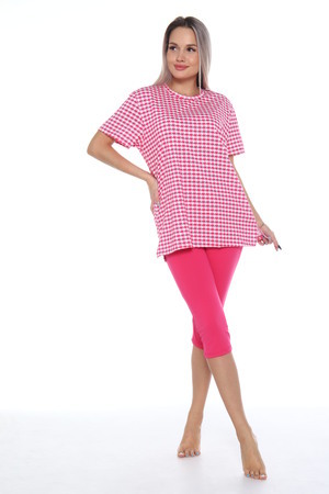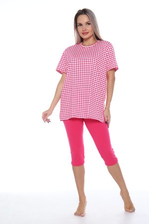 Комплект состоит из футболки и бриджей. Свободная футболка. Бриджи плотно прилегающие. Комплект подойдет на любой тип фигуры.