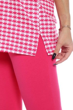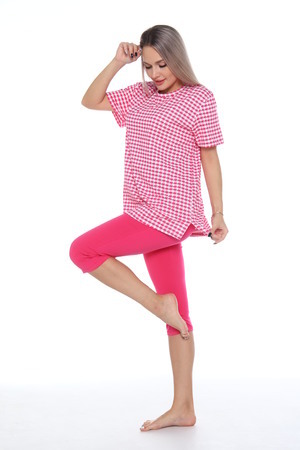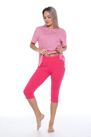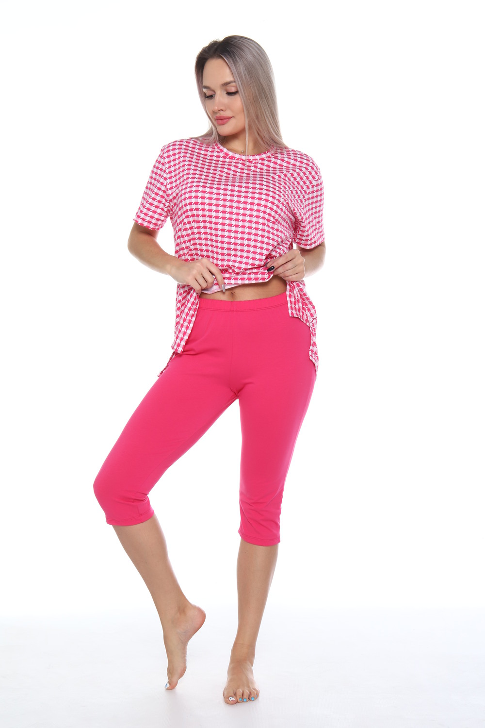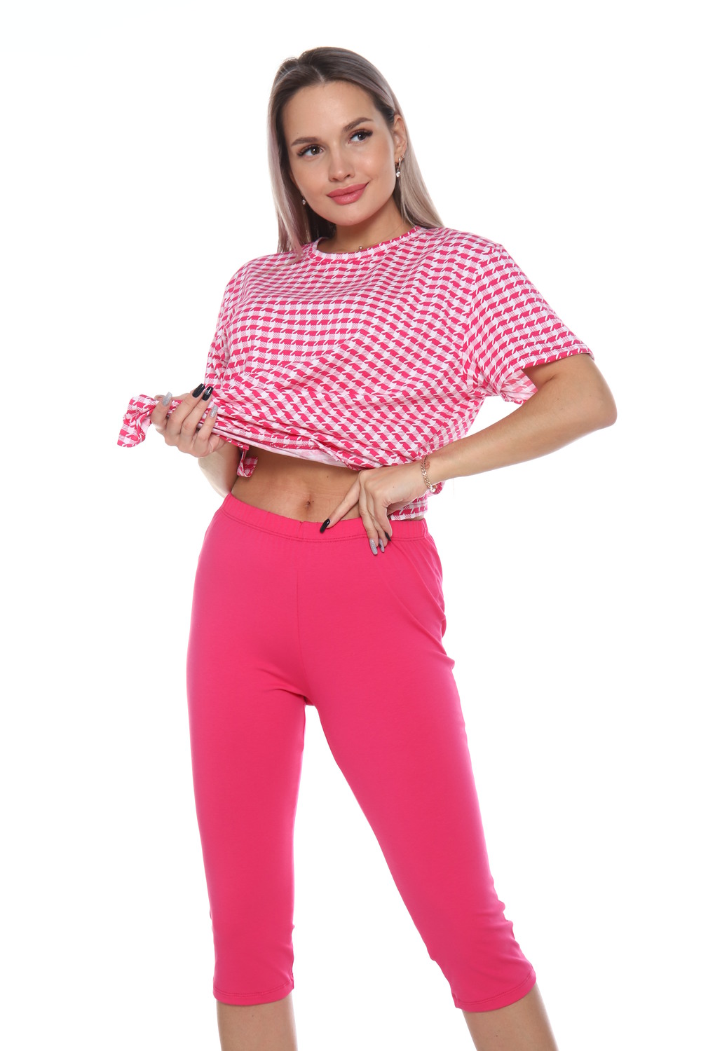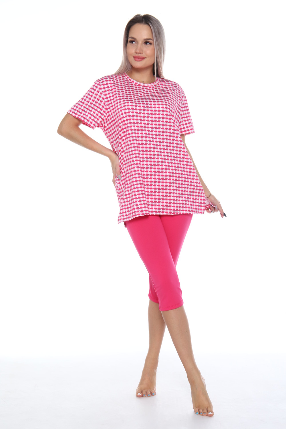 Комплект состоит из футболки и бриджей. Свободная футболка. Бриджи плотно прилегающие. Комплект подойдет на любой тип фигуры.