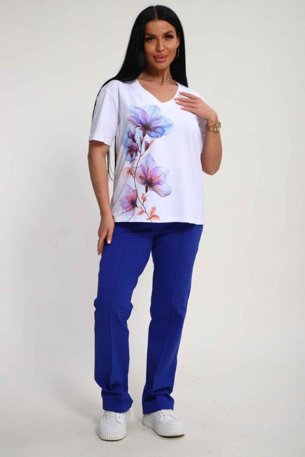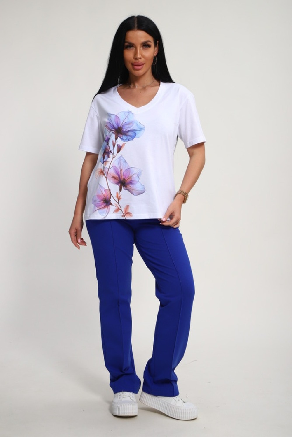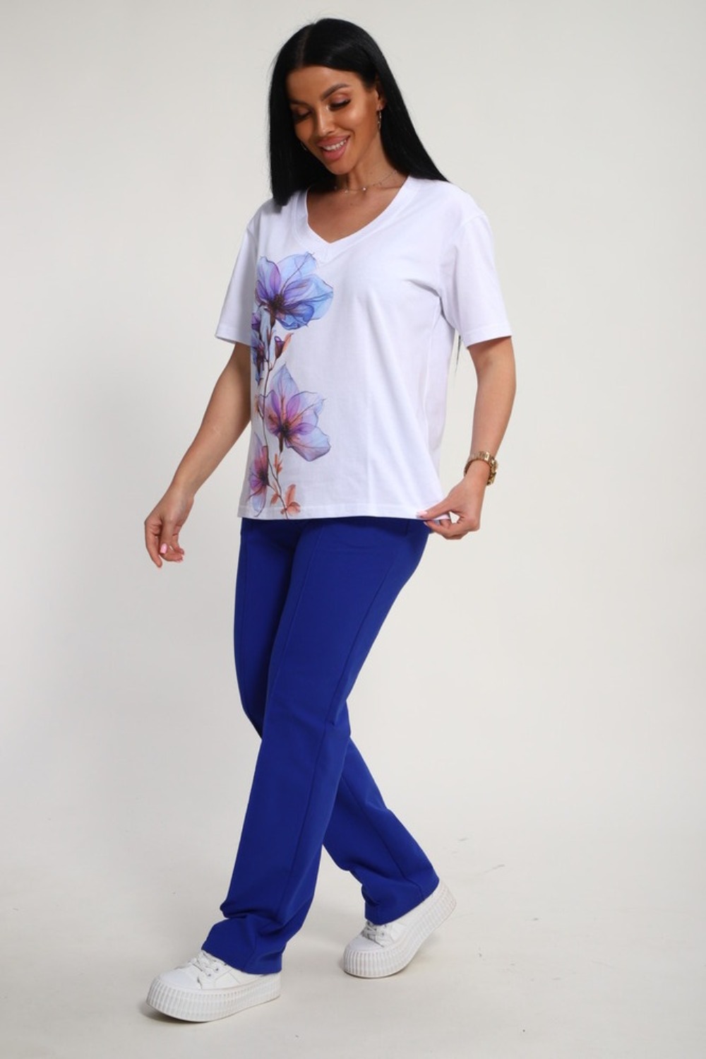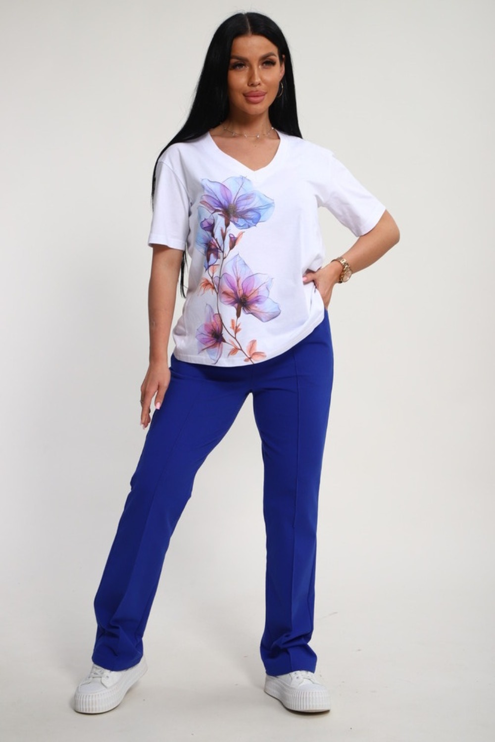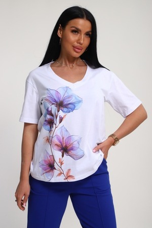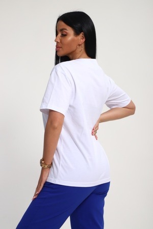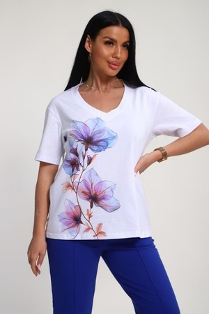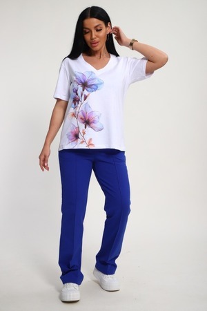 Костюм женский – это стильный и идеальный предмет гардероба ,идеально подходящий для дома и отдыха на любой период :весенний ,осенний, летний и зимний. Комплект состоит из футболки с красочным принтом и брюки со стрелками, в контрастном цвете. В составе ткани 100% хлопок . Хлопковый материал очень комфортный и лёгкий в носке. Брюки с удобной посадкой придадут вашему образу стильный и модный вид. Базовый современный костюмчик – популярный повседневный .