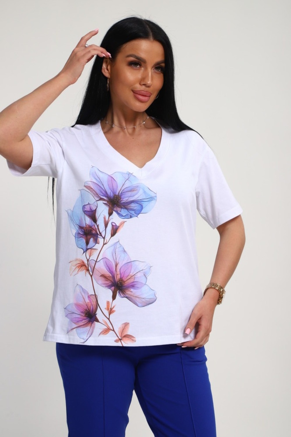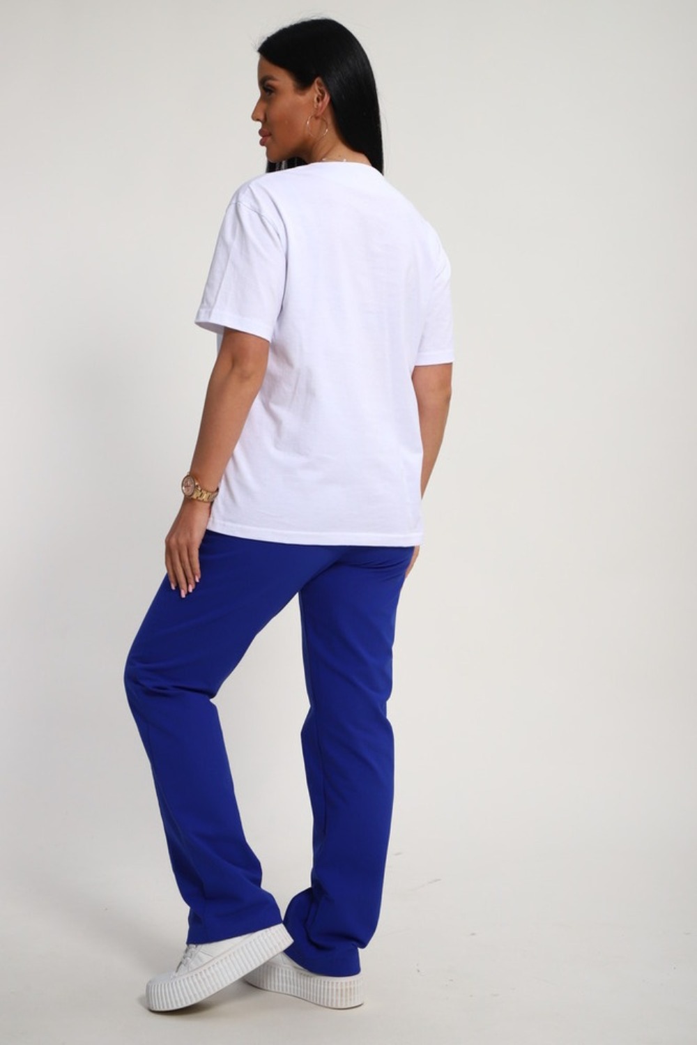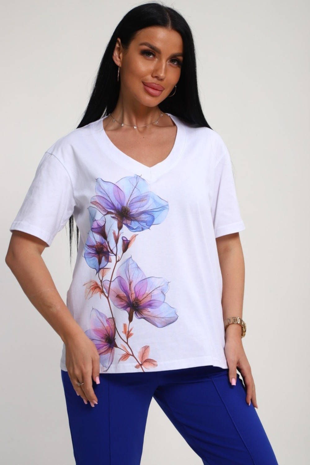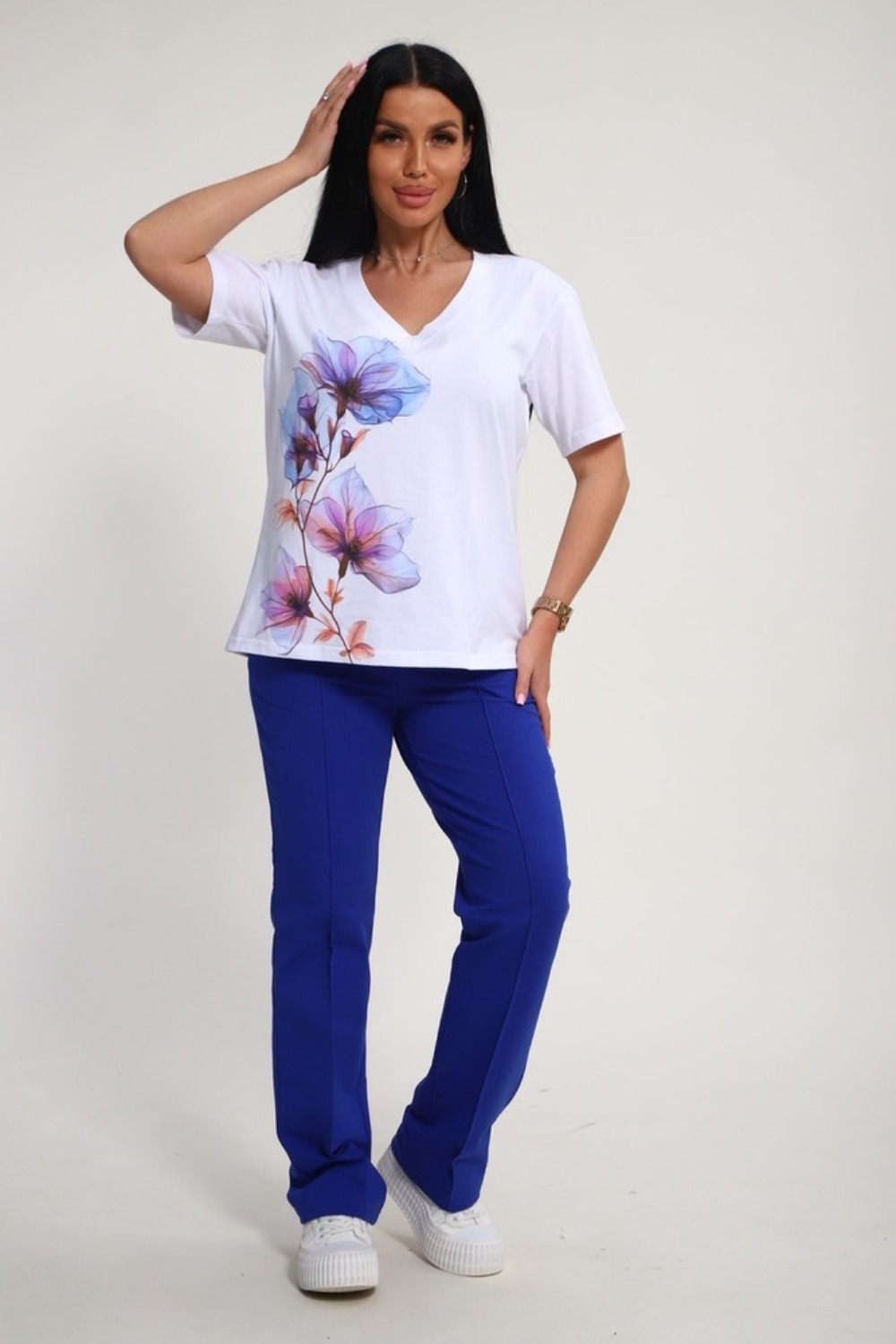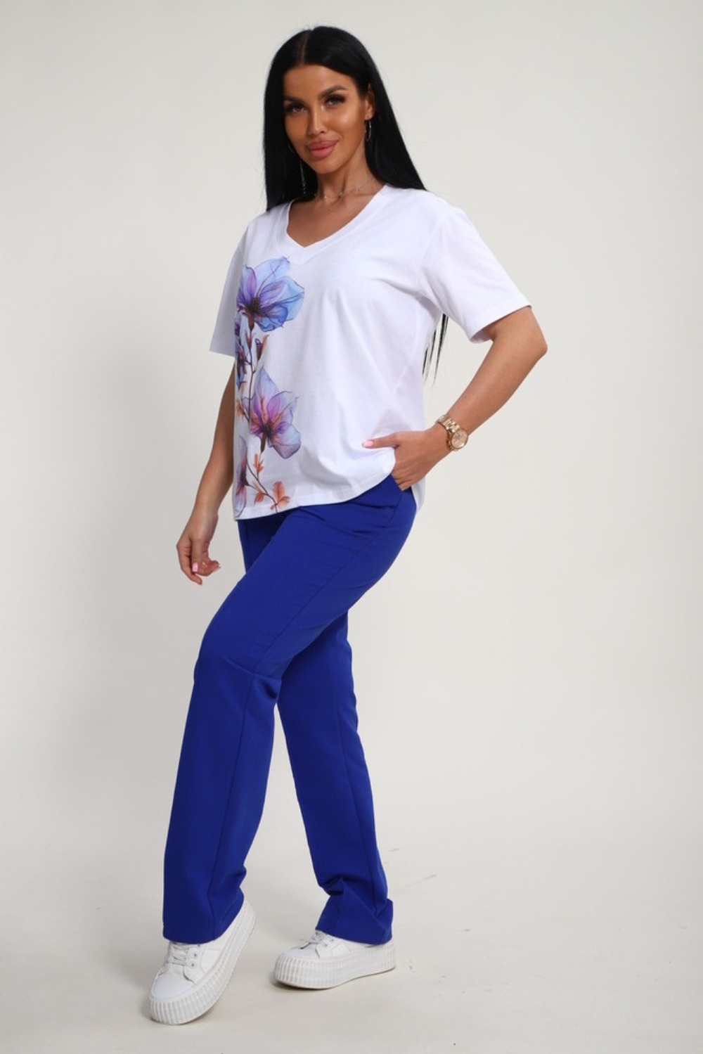 Костюм женский – это стильный и идеальный предмет гардероба ,идеально подходящий для дома и отдыха на любой период :весенний ,осенний, летний и зимний. Комплект состоит из футболки с красочным принтом и брюки со стрелками, в контрастном цвете. В составе ткани 100% хлопок . Хлопковый материал очень комфортный и лёгкий в носке. Брюки с удобной посадкой придадут вашему образу стильный и модный вид. Базовый современный костюмчик – популярный повседневный .