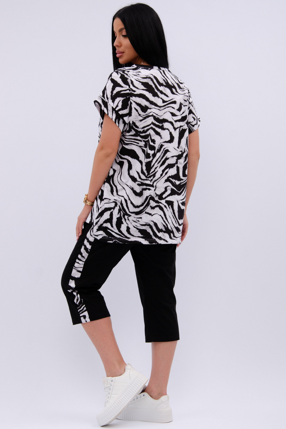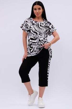 Женский костюм из футболки и бриджей — отличный выбор для дачного сезона и прогулок. Бриджи черного цвета из 100% хлопка обеспечивают комфорт и свободу движения, что особенно важно для активного отдыха на свежем воздухе или дома.