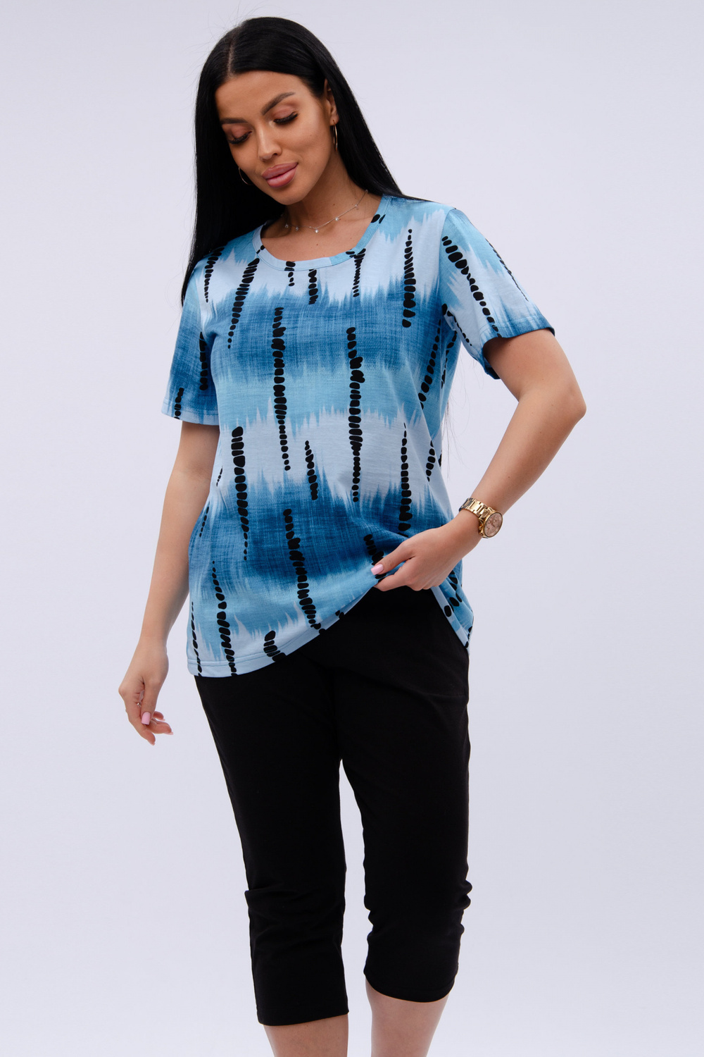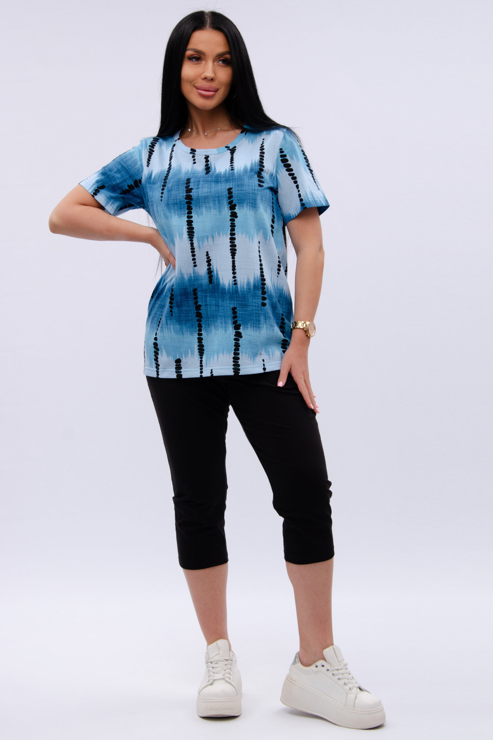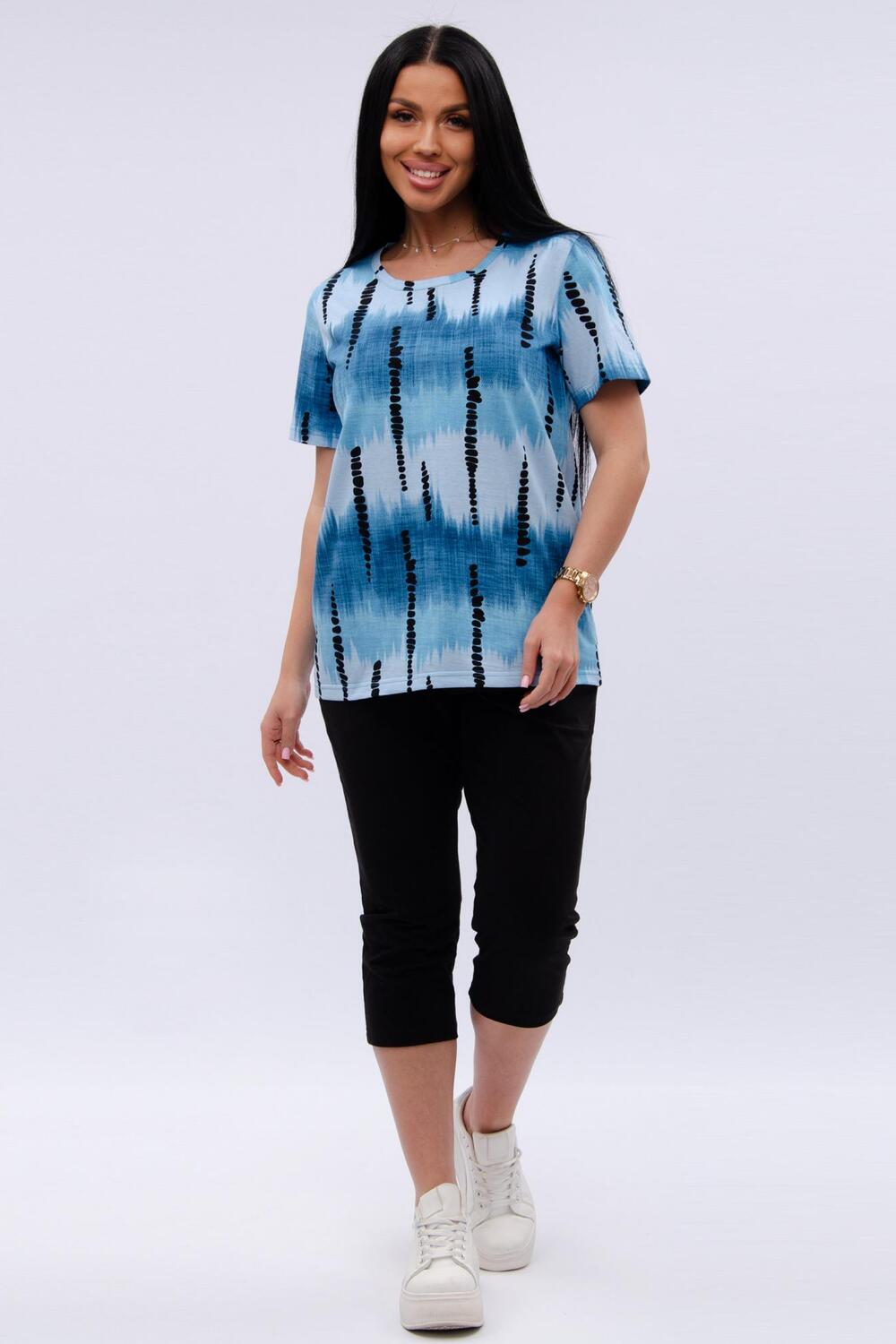 Женский костюм из футболки и бриджей — отличный выбор для дачного сезона и прогулок. Бриджи черного цвета из 100% хлопка обеспечивают комфорт и свободу движения, что особенно важно для активного отдыха на свежем воздухе или дома.