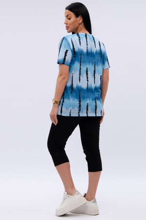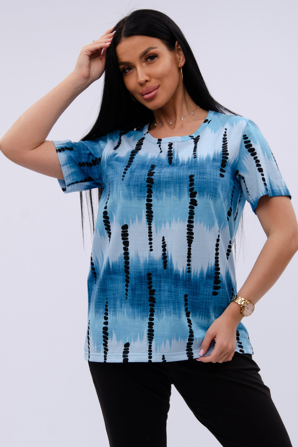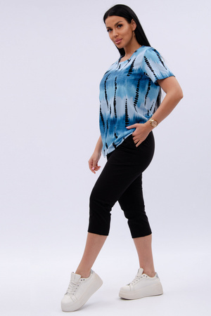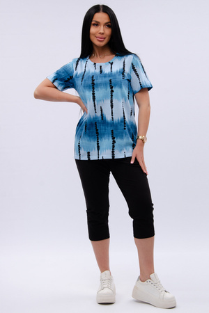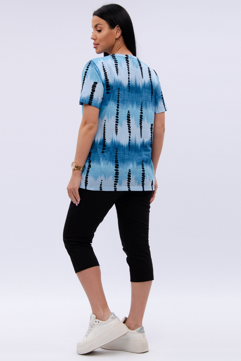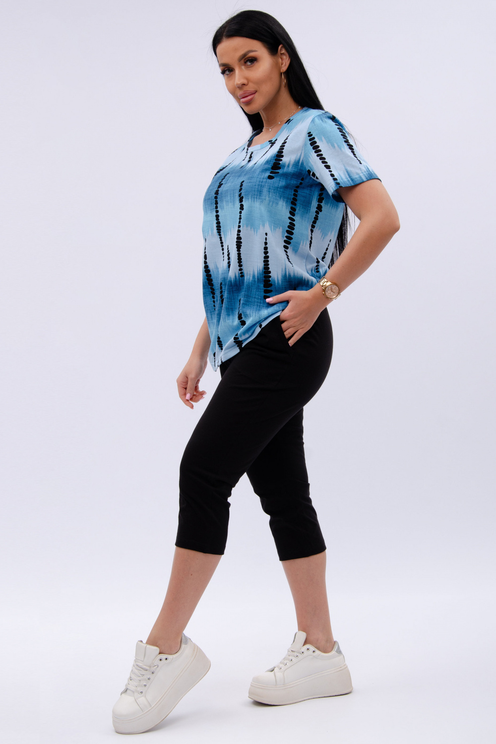 Женский костюм из футболки и бриджей — отличный выбор для дачного сезона и прогулок. Бриджи черного цвета из 100% хлопка обеспечивают комфорт и свободу движения, что особенно важно для активного отдыха на свежем воздухе или дома.