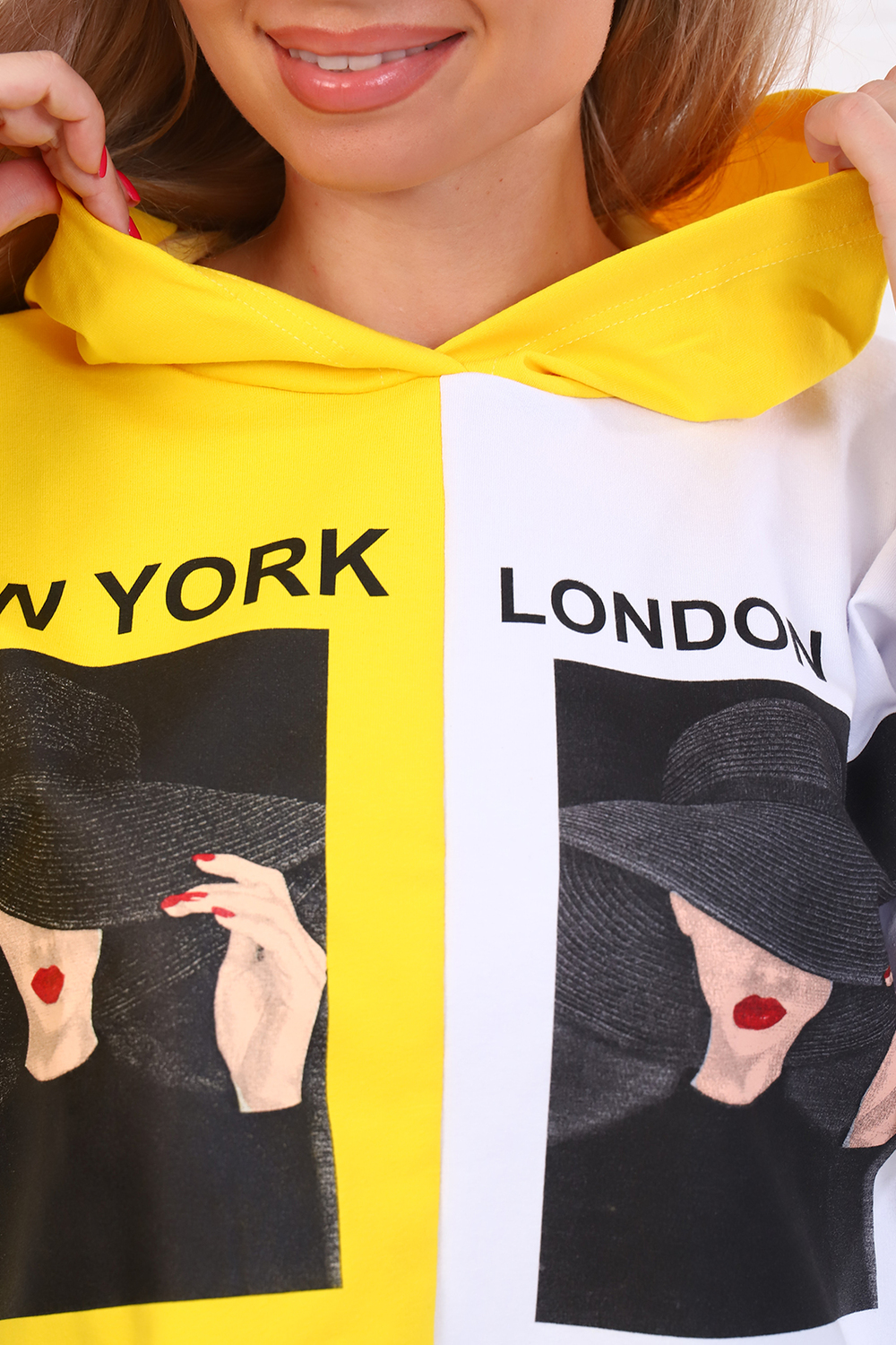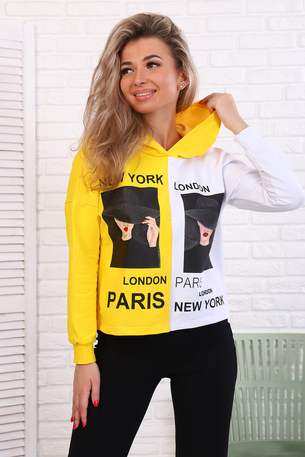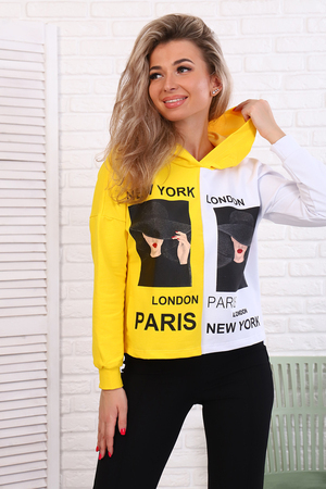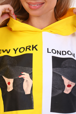 Толстовка женская укороченная со спущенным плечом, втачным длинным рукавом на манжете, с капюшоном. На детали переда печать.