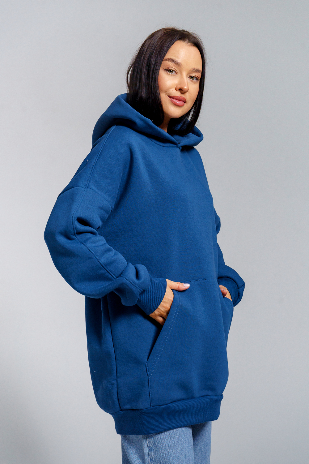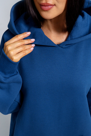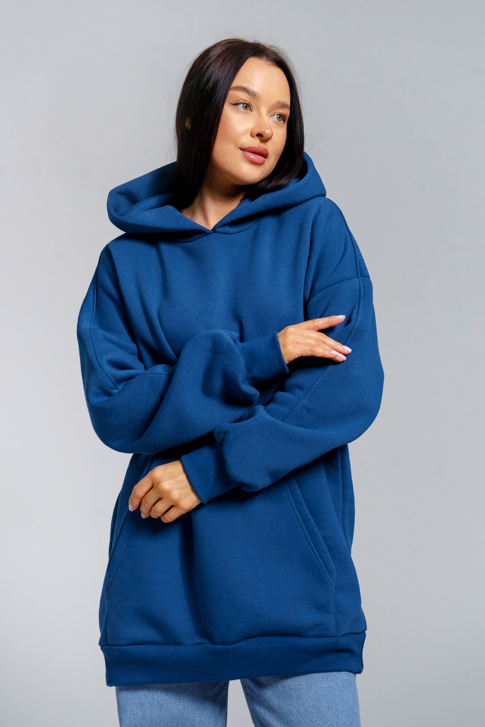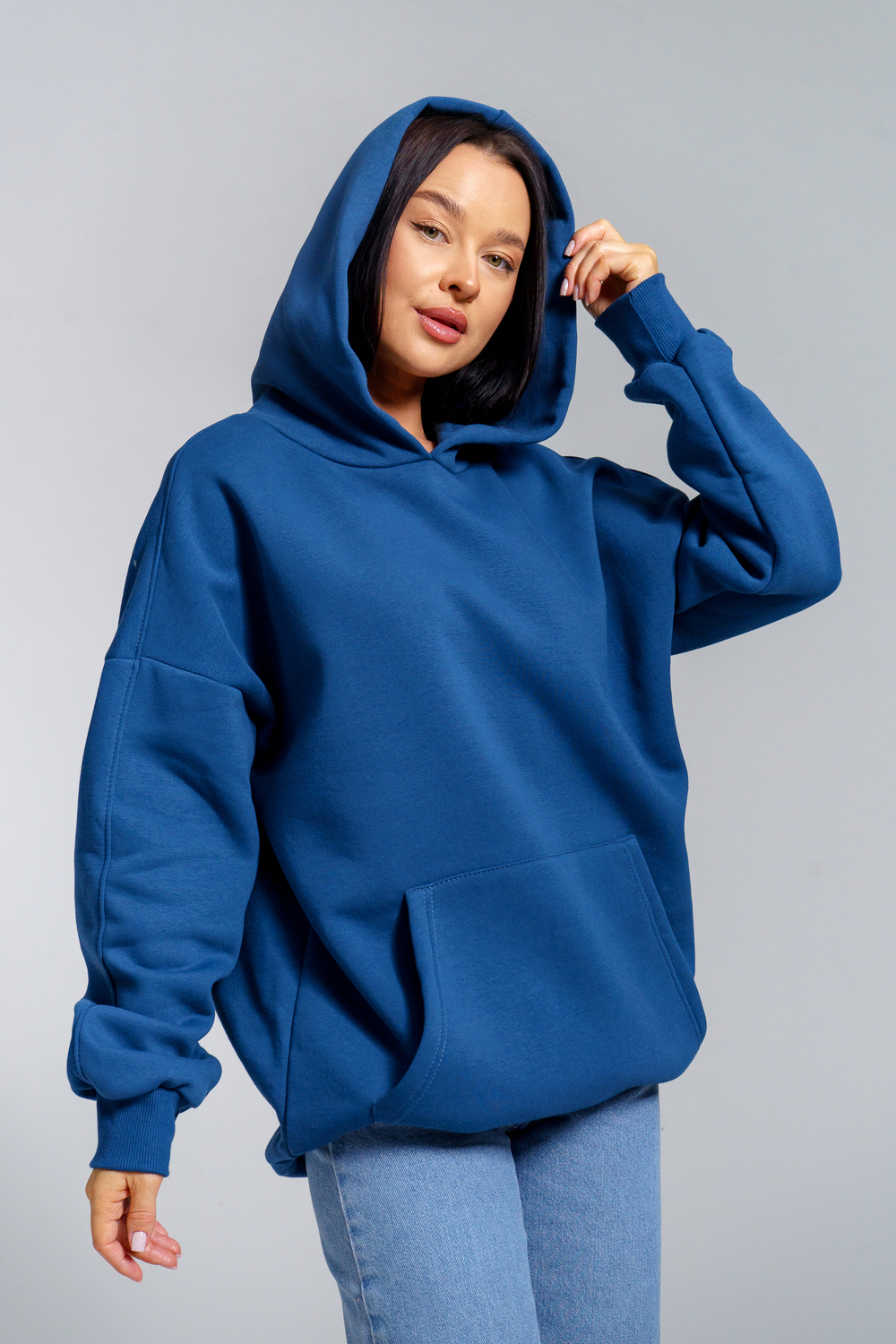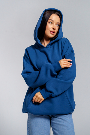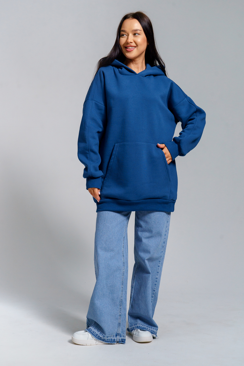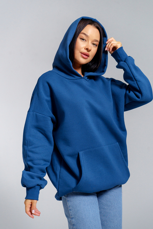 Толстовка из футера с начесом объемного покроя. Двойной капюшон, карман-кенгуру. Срезы обработаны кашкорсе в цвет основной ткани.