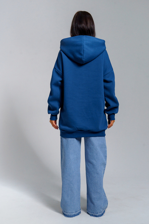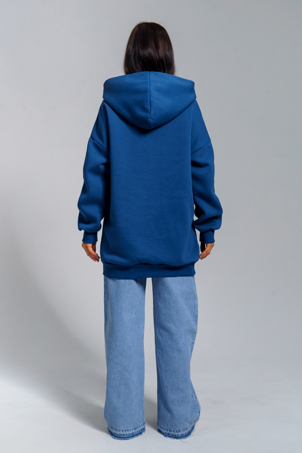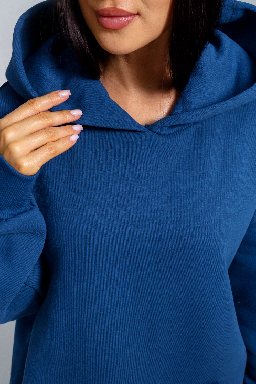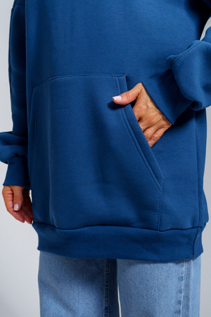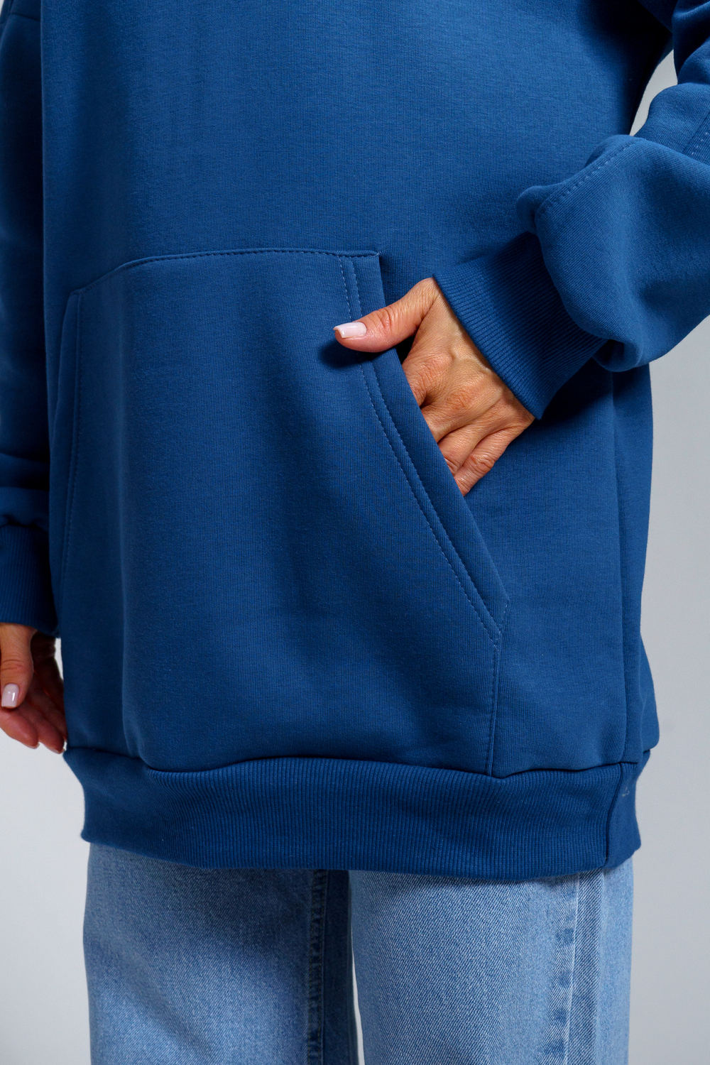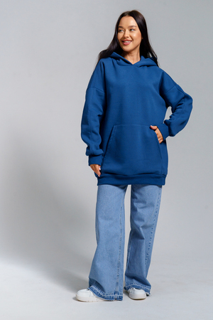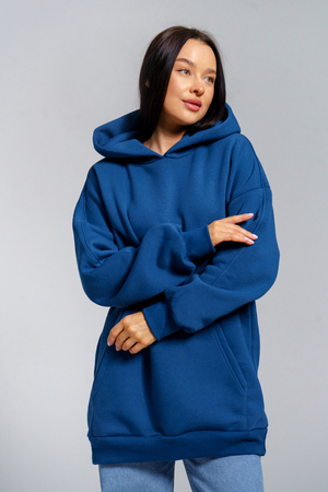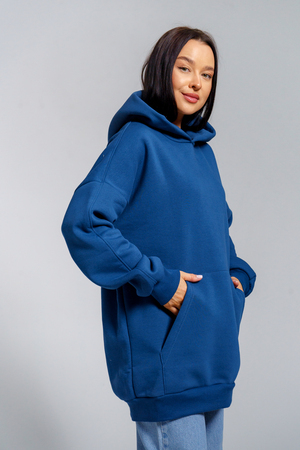 Толстовка из футера с начесом объемного покроя. Двойной капюшон, карман-кенгуру. Срезы обработаны кашкорсе в цвет основной ткани.