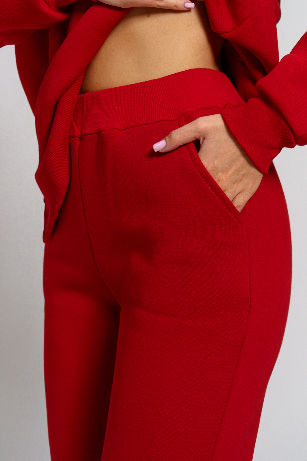 Костюм женский. Куртка с длинным втачным рукавом на манжете, по низу изделия притачной пояс. Брюки на притачном поясе с резинкой, боковым карманом, по низу изделия манжета.