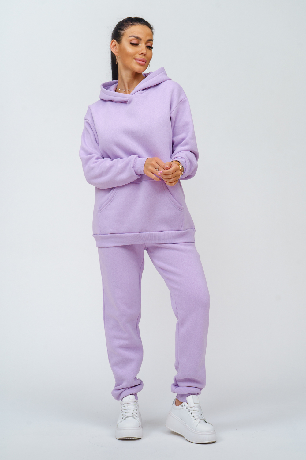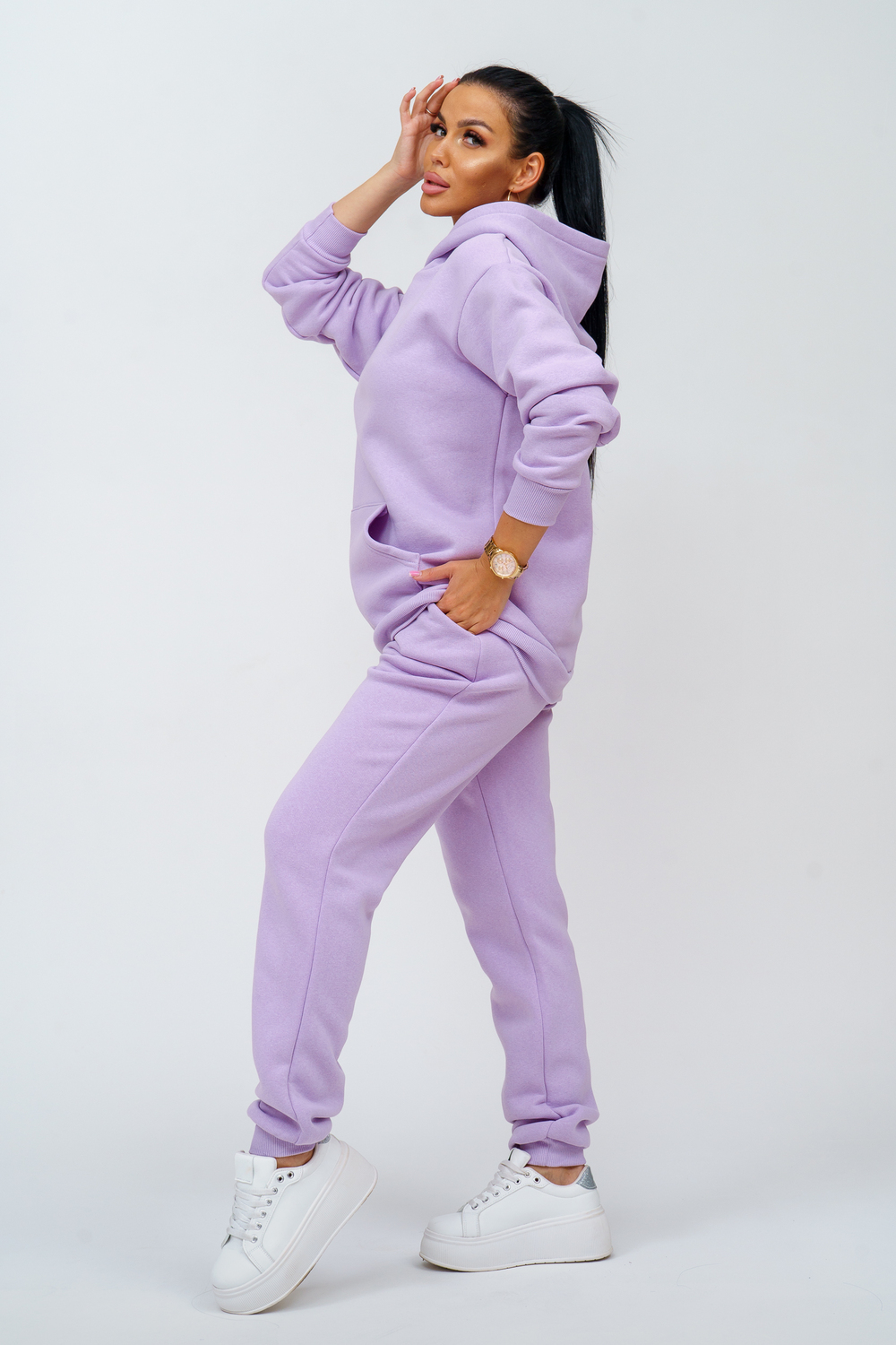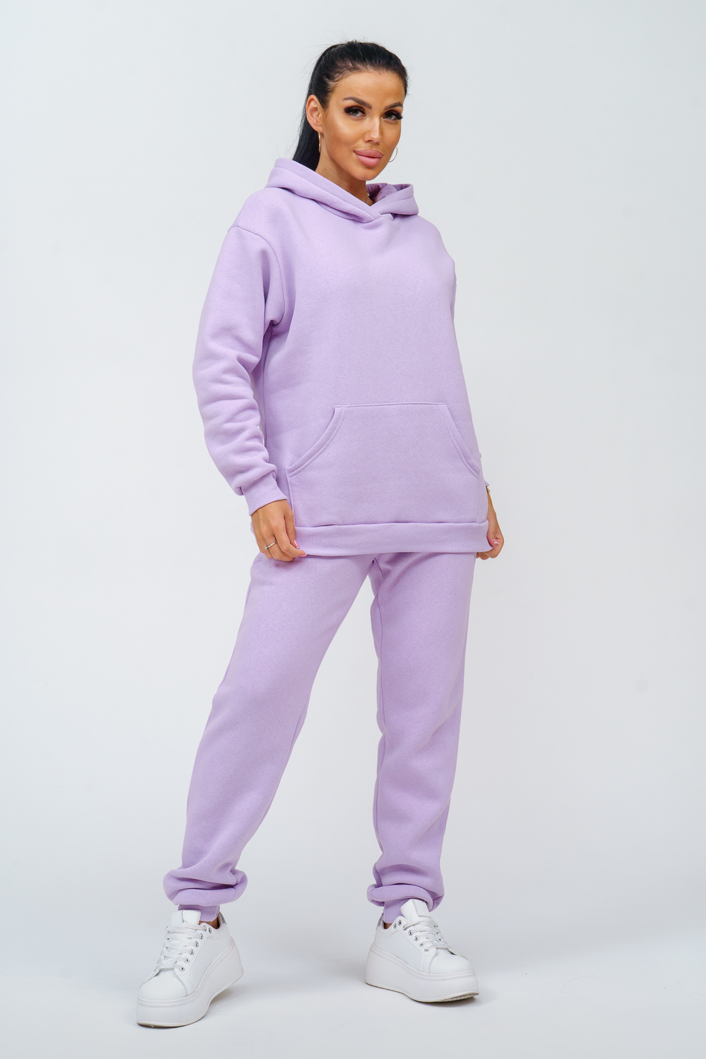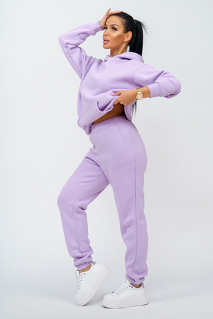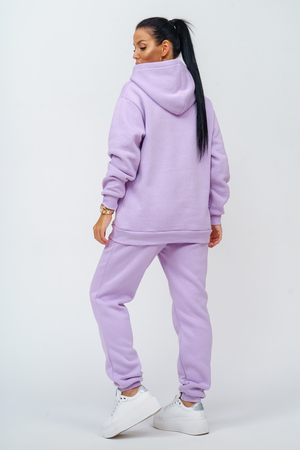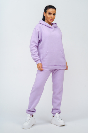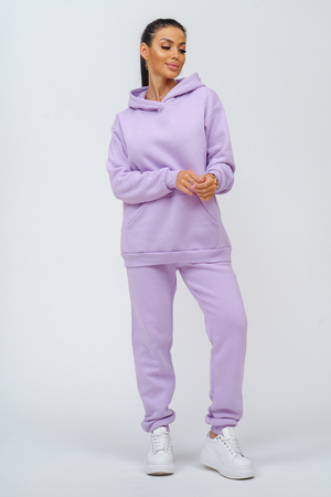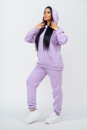 Костюм женский. Куртка со спущенным рукавом на манжете, двойным капюшоном и накладным карманом. Брюки на притачном поясе с резинкой, по низу изделия манжета. На передней части брюк - карманы.