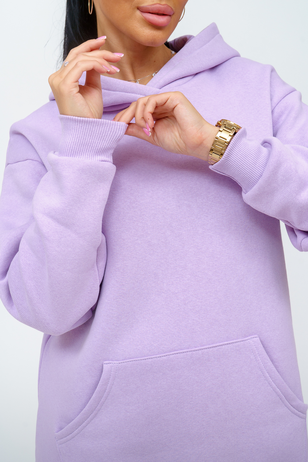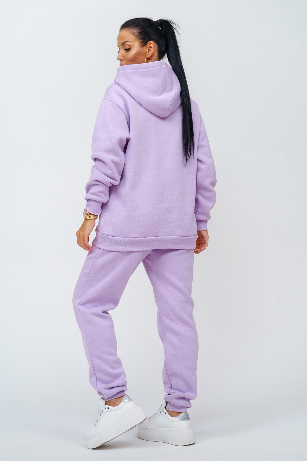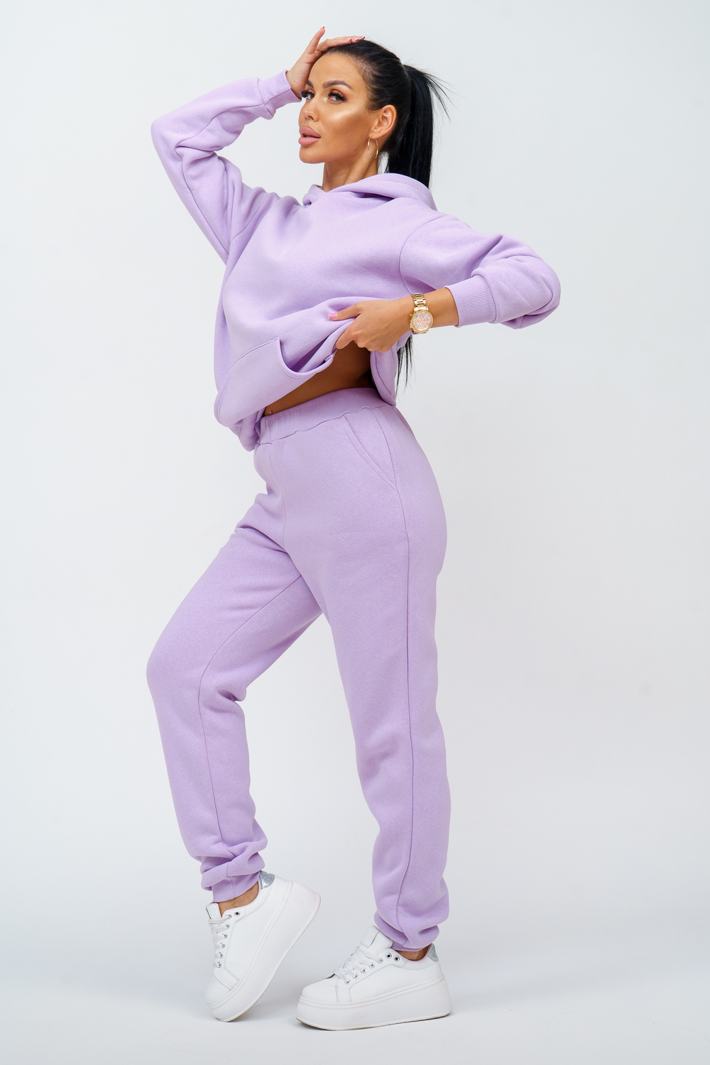 Костюм женский. Куртка со спущенным рукавом на манжете, двойным капюшоном и накладным карманом. Брюки на притачном поясе с резинкой, по низу изделия манжета. На передней части брюк - карманы.