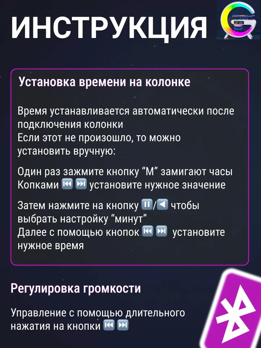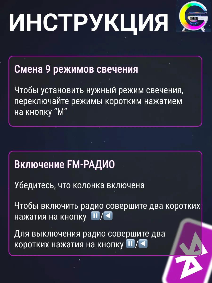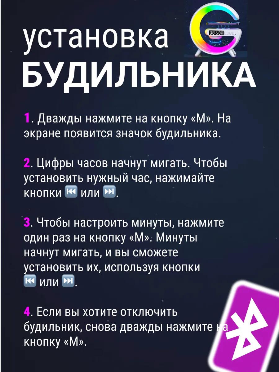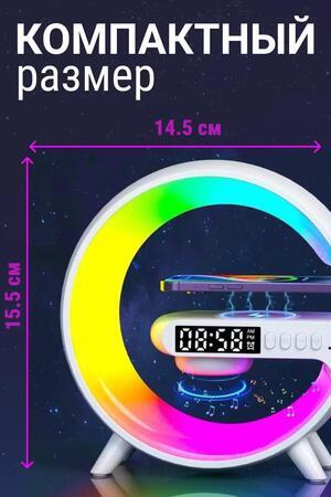 Умная колонка 6 в 1 – стиль, удобство и технологии в одном устройстве! Этот инновационный гаджет объединяет сразу 6 полезных функций: RGB-ночник – мягкое освещение с 7 режимами подсветки создаст уютную атмосферу. Беспроводная зарядка – просто положите смартфон на верхнюю панель, и он начнет заряжаться. Bluetooth-колонка – слушайте любимую музыку с качественным звучанием. Часы и будильник – всегда будьте в курсе времени, а приятный сигнал разбудит без стресса. FM-радио – любимые радиостанции всегда под рукой. Элегантный дизайн – современный стильный аксессуар украсит ваш интерьер. Почему стоит выбрать именно эту колонку? Многофункциональность – заменяет сразу несколько устройств. Простота управления – удобные кнопки на передней панели. 7 режимов подсветки – выберите цвет в зависимости от настроения. Компактный размер – не занимает много места на прикроватной тумбе или рабочем столе. Отличный подарок – подойдет для друзей, близких и коллег. Создайте атмосферу уюта и наслаждайтесь любимой музыкой с умной колонкой 6 в 1!